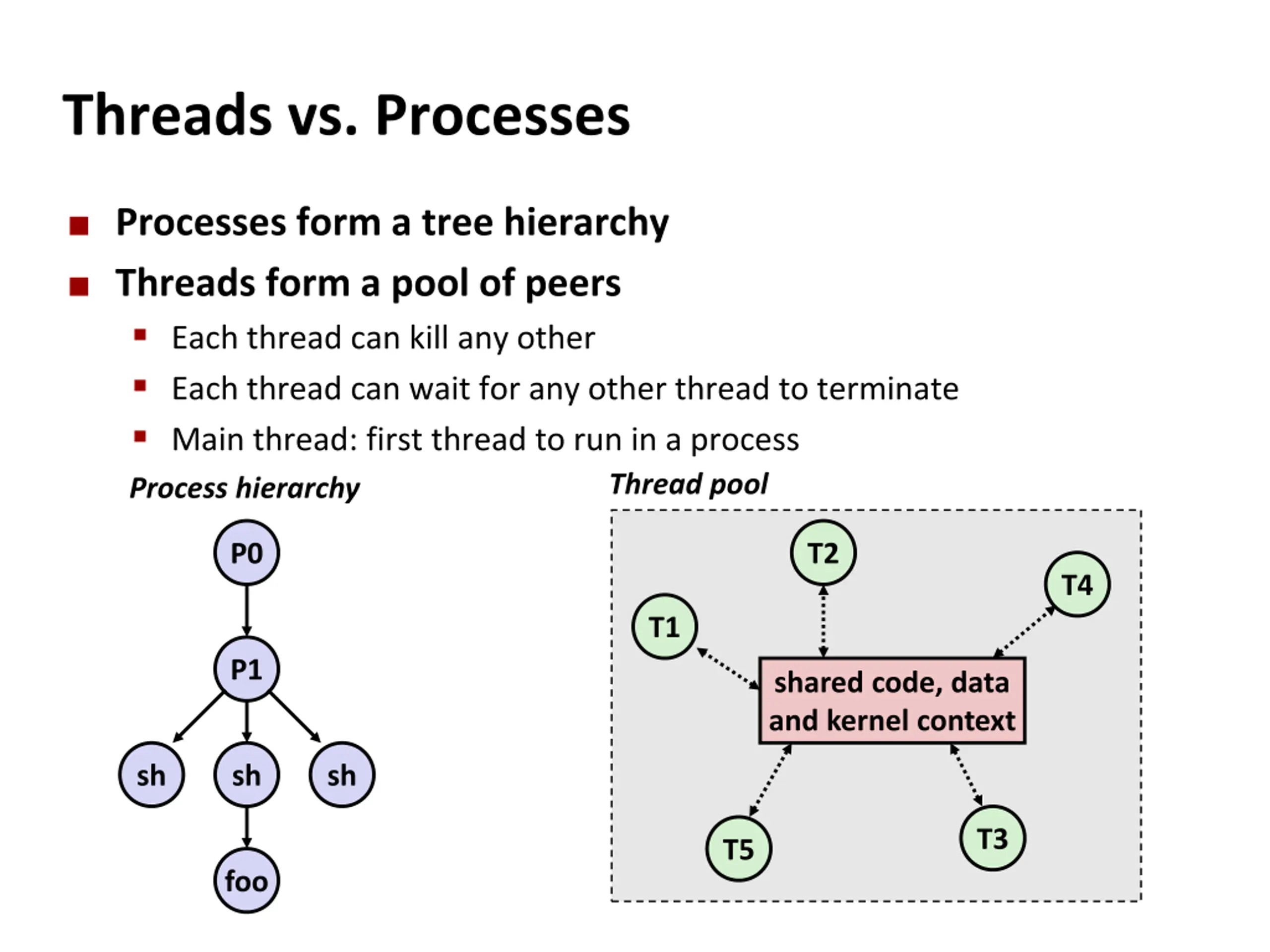 Carnegie Mellon Threads vs. Processes Processes form a tree hierarchy Threads form a pool of peers Each thread can kill any other Each thread can wait for any other thread to terminate Main thread: first thread to run in a process Process hierarchy Thread pool P0 T2 T4 T1 P1 shared code, data and kernel context sh sh sh T3 T5 foo