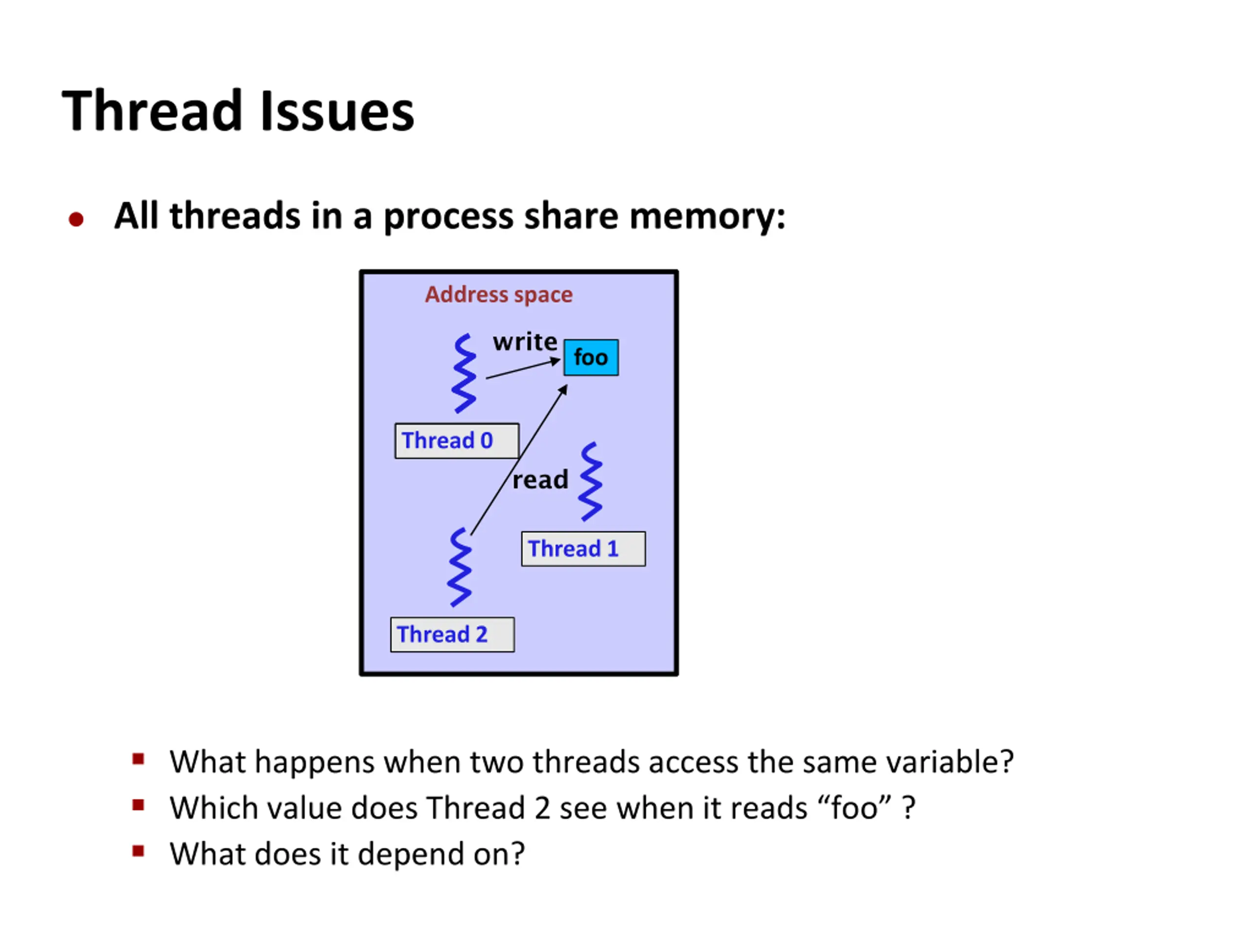 Carnegie Mellon Thread Issues All threads in a process share memory: Address space write foo Thread 0 Thread 0 read Thread 1 Thread 2 What happens when two threads access the same variable? Which value does Thread 2 see when it reads foo ? What does it depend on?