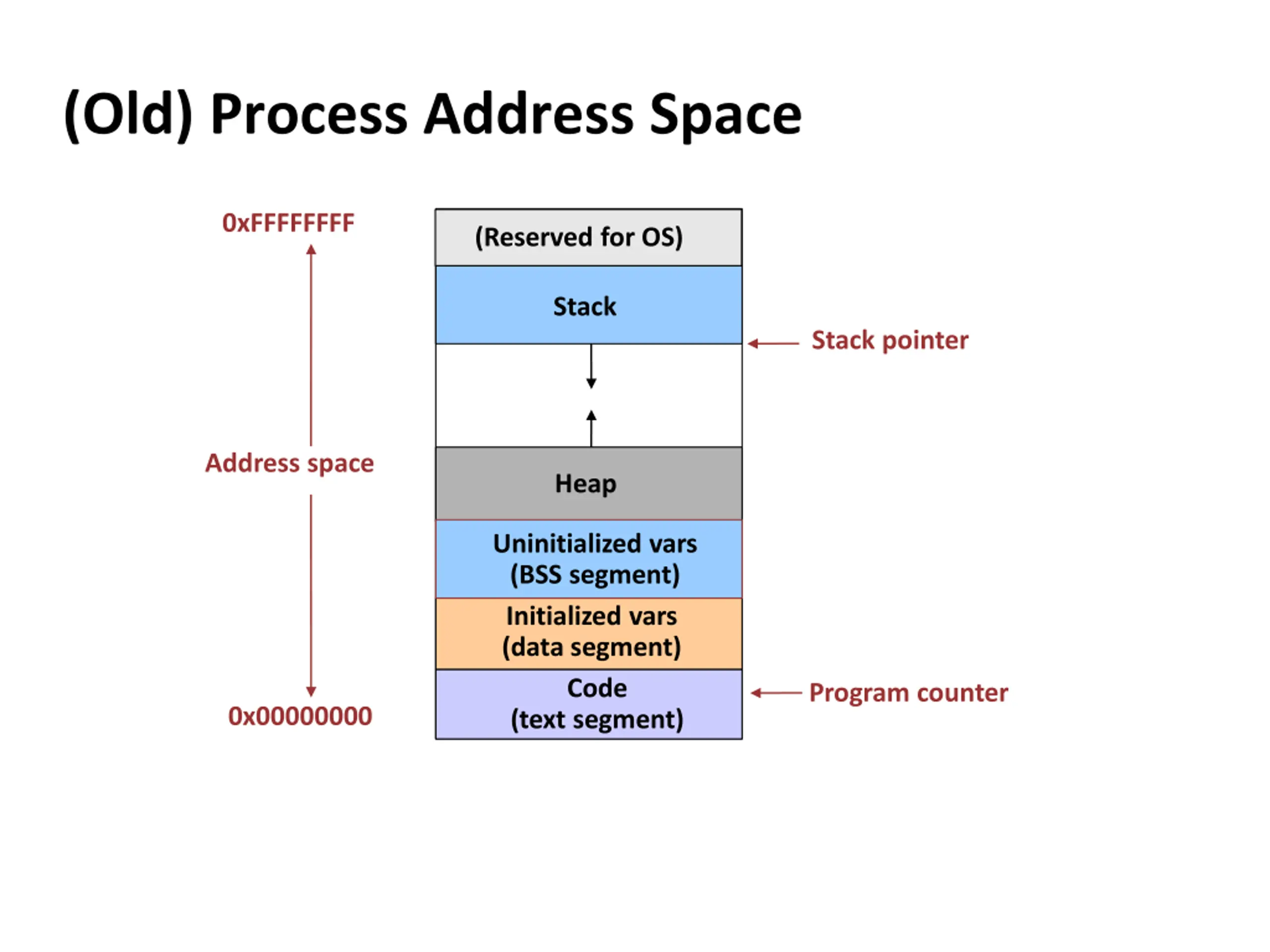 Carnegie Mellon (Old) Process Address Space 0xFFFFFFFF (Reserved for OS) Stack Stack pointer Address space Heap Uninitialized vars (BSS segment) Initialized vars (data segment) Code (text segment) Program counter 0x00000000