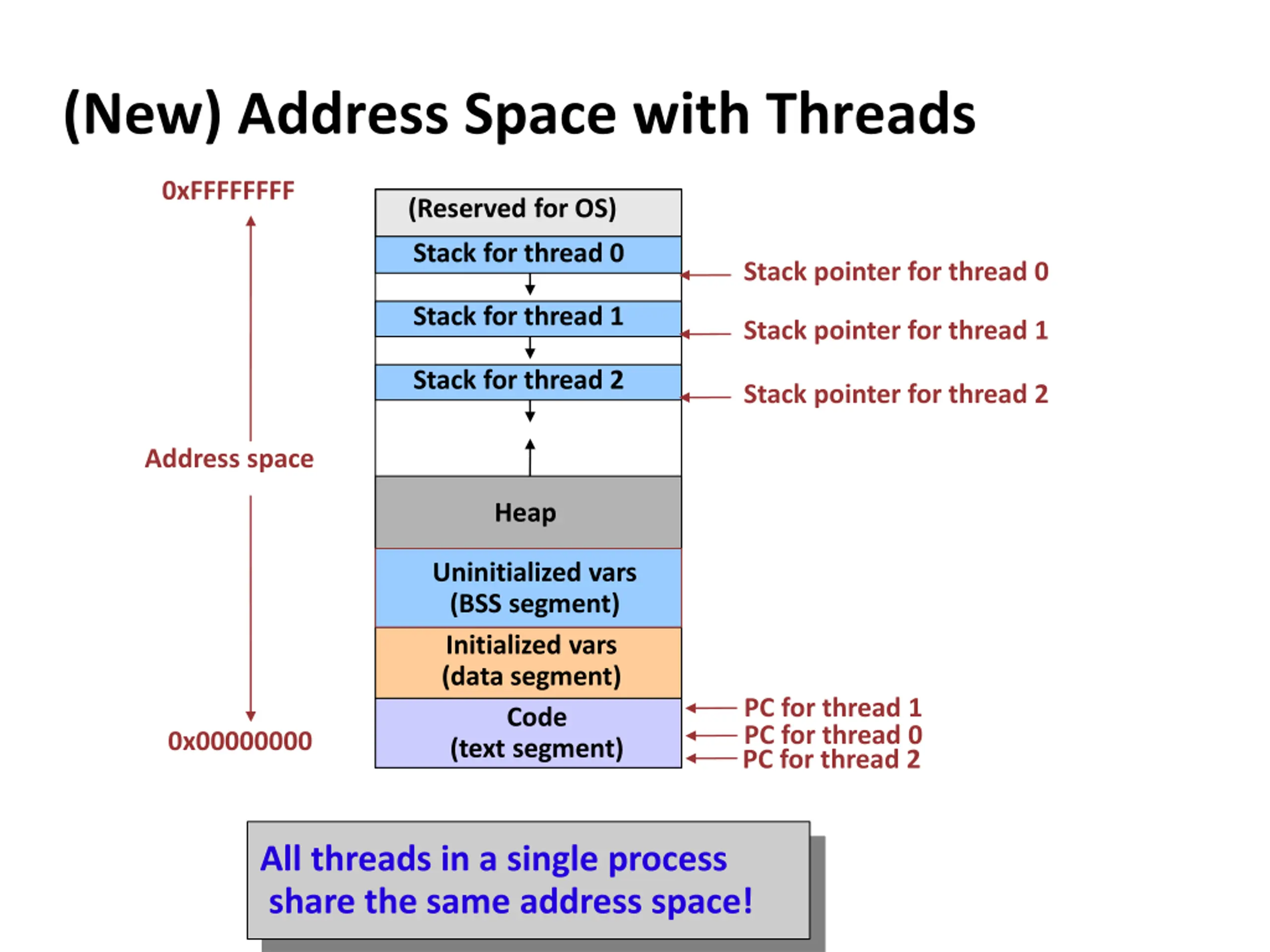 Carnegie Mellon (New) Address Space with Threads 0xFFFFFFFF (Reserved for OS) Stack for thread 0 Stack pointer for thread 0 Stack for thread 1 Stack pointer for thread 1 Stack for thread 2 Stack pointer for thread 2 Address space Heap Uninitialized vars (BSS segment) Initialized vars (data segment) Code (text segment) PC for thread 1 PC for thread 0 PC for thread 2 0x00000000 All threads in a single process share the same address space!