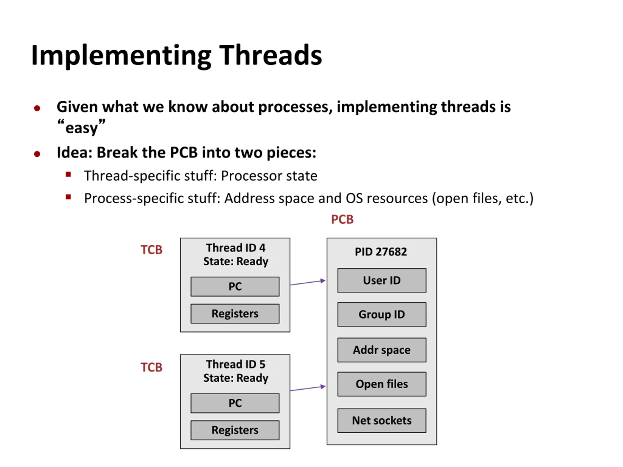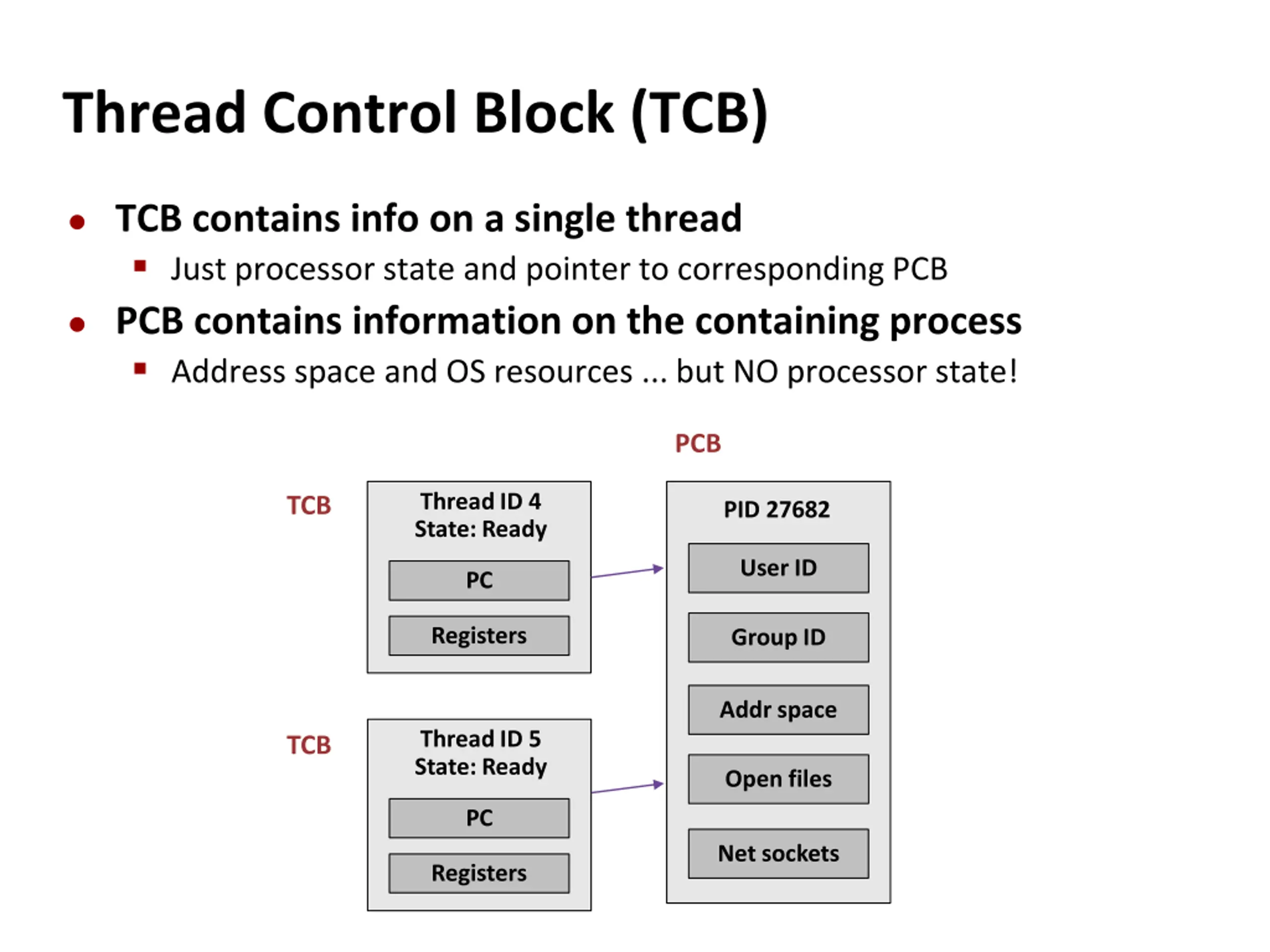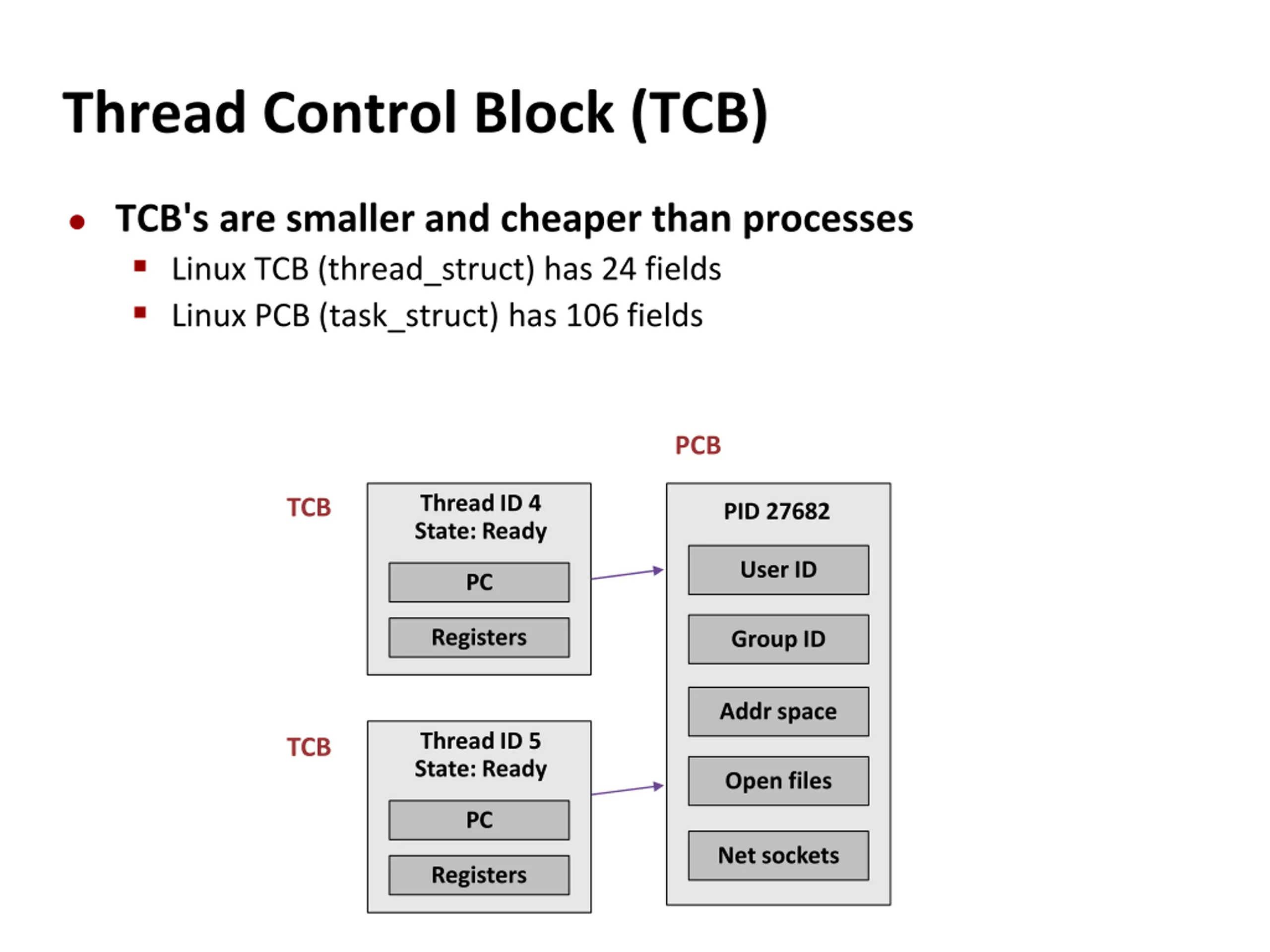 Carnegie Mellon Thread Control Block (TCB) TCB's are smaller and cheaper than processes Linux TCB (thread_struct) has 24 fields Linux PCB (task_struct) has 106 fields PCB Thread ID 4 State: Ready TCB PID 27682 User ID PC Registers Group ID Addr space Thread ID 5 State: Ready TCB Open files PC Net sockets Registers