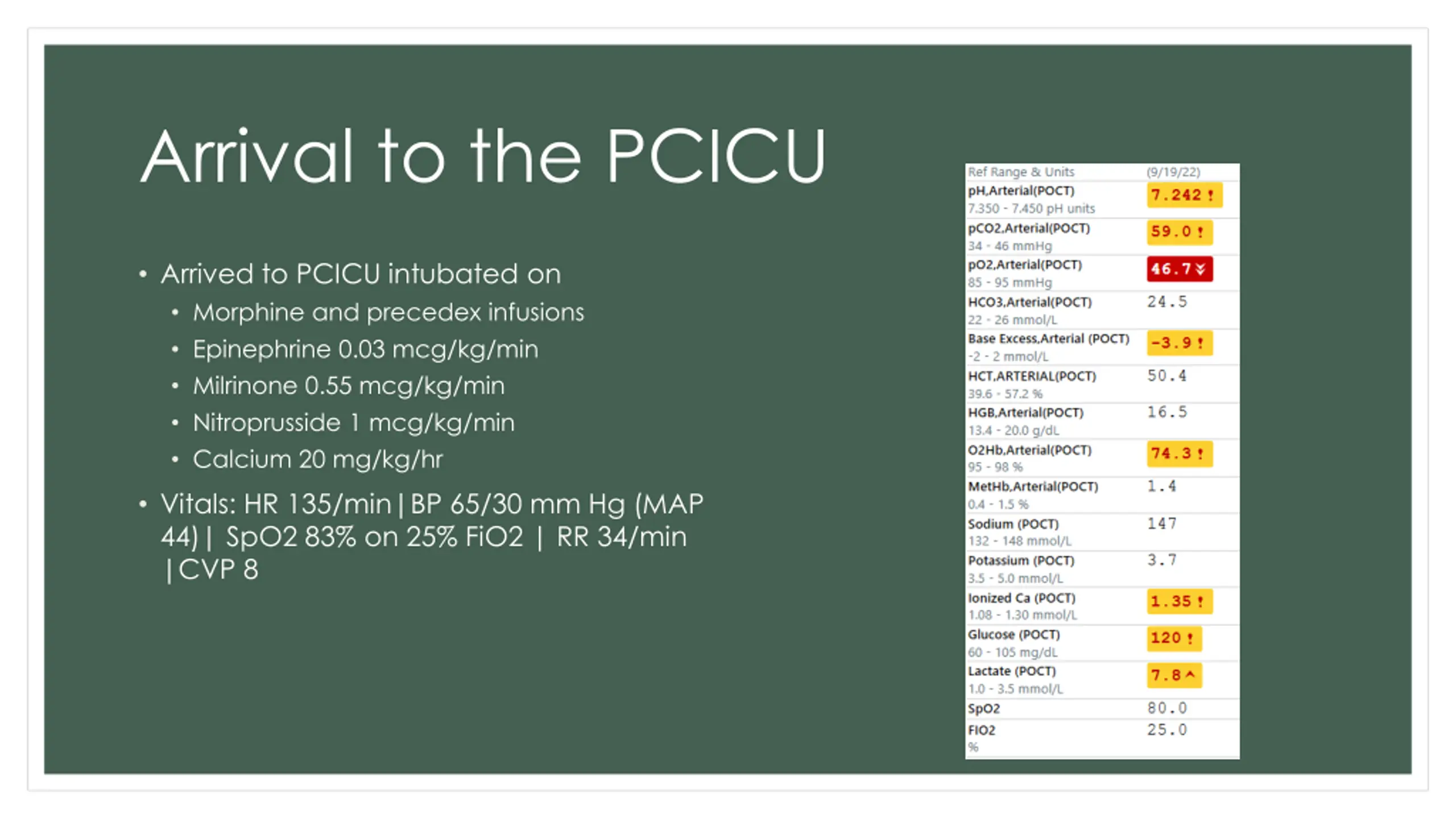 Arrival to the PCICU Arrived to PCICU intubated on Morphine and precedex infusions Epinephrine 0.03 mcg/kg/min Milrinone 0.55 mcg/kg/min Nitroprusside 1 mcg/kg/min Calcium 20 mg/kg/hr Vitals: HR 135/min|BP 65/30 mm Hg (MAP 44)| SpO2 83% on 25% FiO2 | RR 34/min |CVP 8