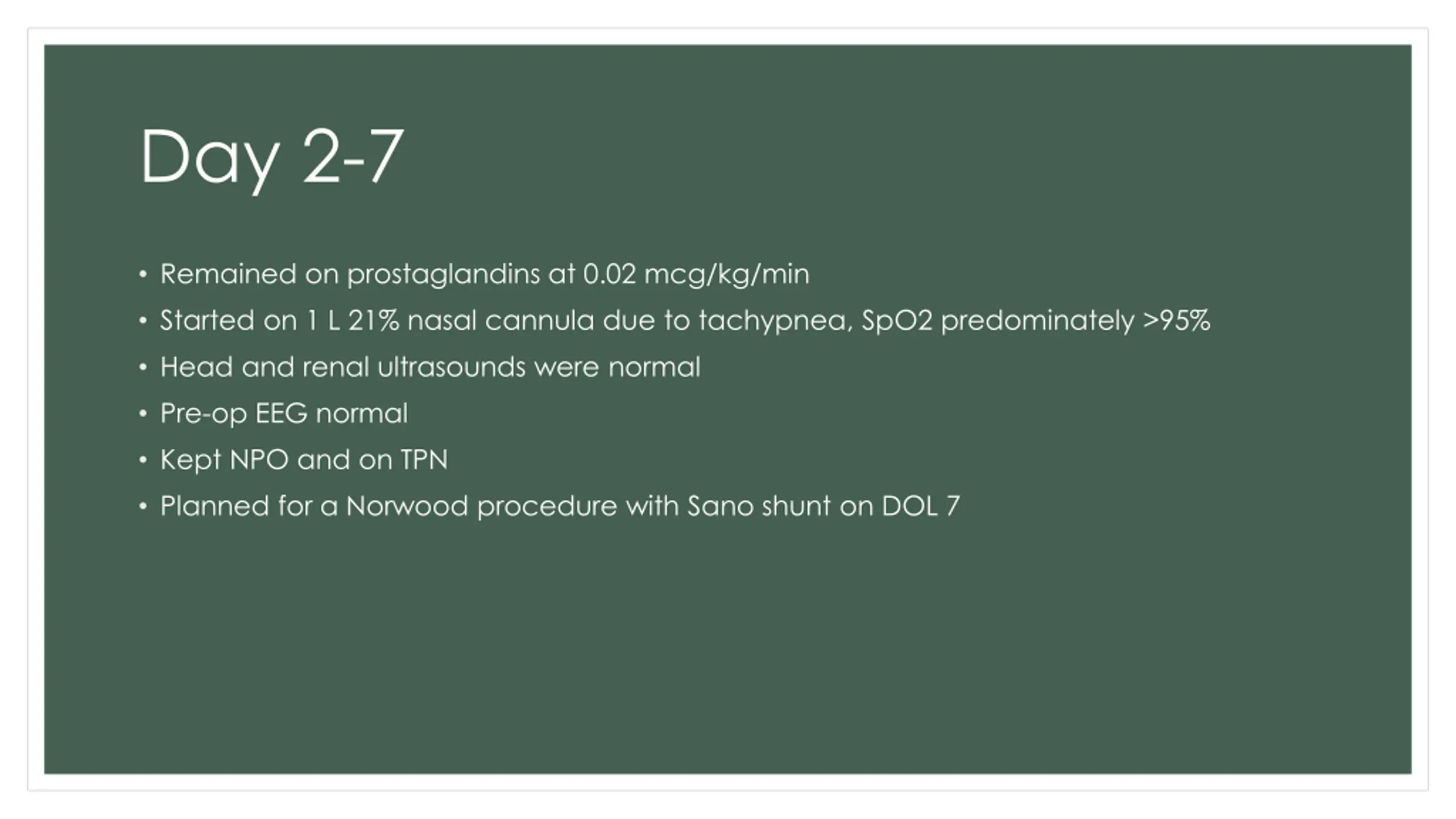 Day 2-7 Remained on prostaglandins at 0.02 mcg/kg/min Started on 1 L 21% nasal cannula due to tachypnea, SpO2 predominately >95% Head and renal ultrasounds were normal Pre-op EEG normal Kept NPO and on TPN Planned for a Norwood procedure with Sano shunt on DOL 7