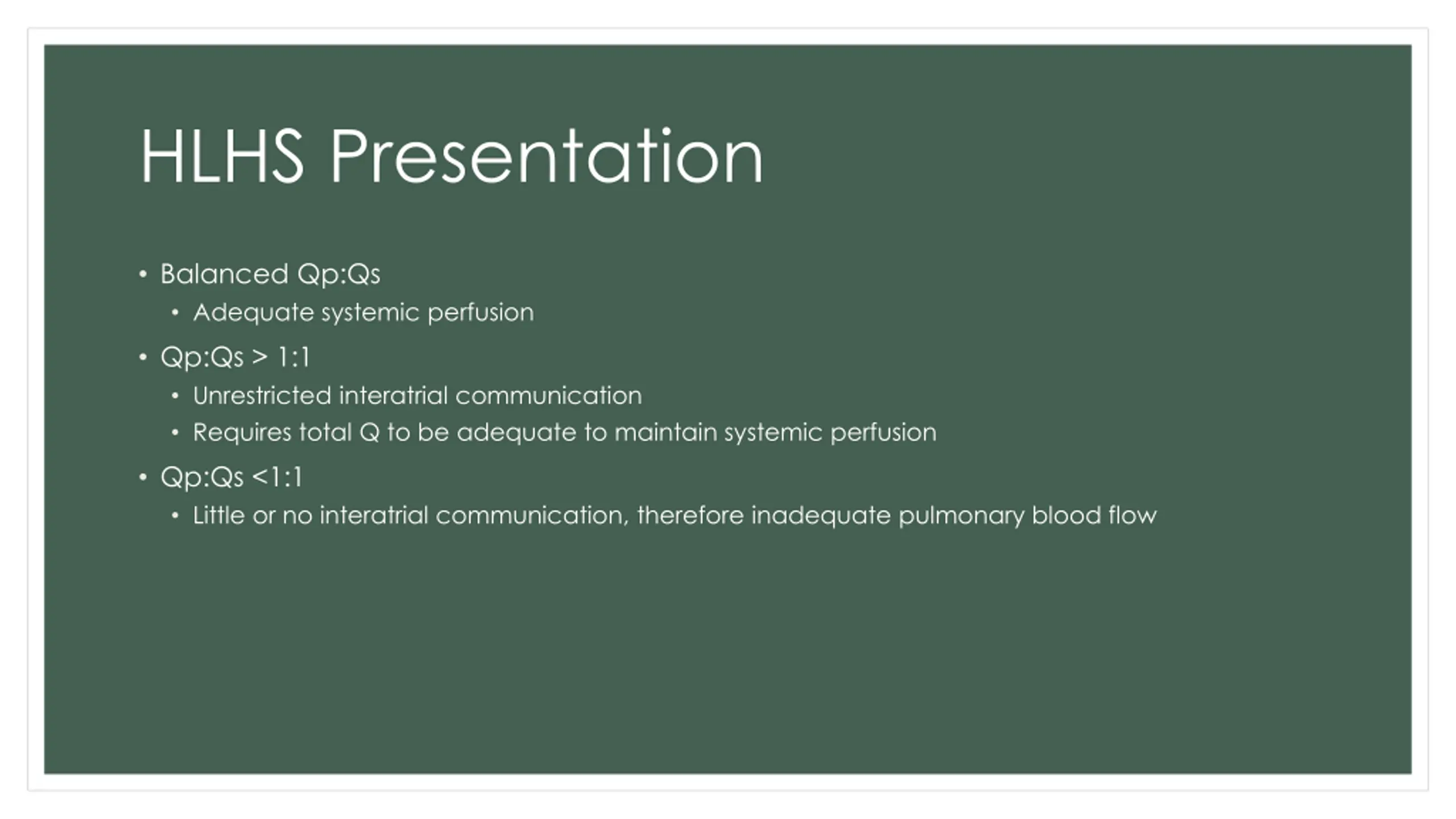 HLHS Presentation Balanced Qp:Qs Adequate systemic perfusion Qp:Qs > 1:1 Unrestricted interatrial communication Requires total Q to be adequate to maintain systemic perfusion Qp:Qs <1:1 Little or no interatrial communication, therefore inadequate pulmonary blood flow