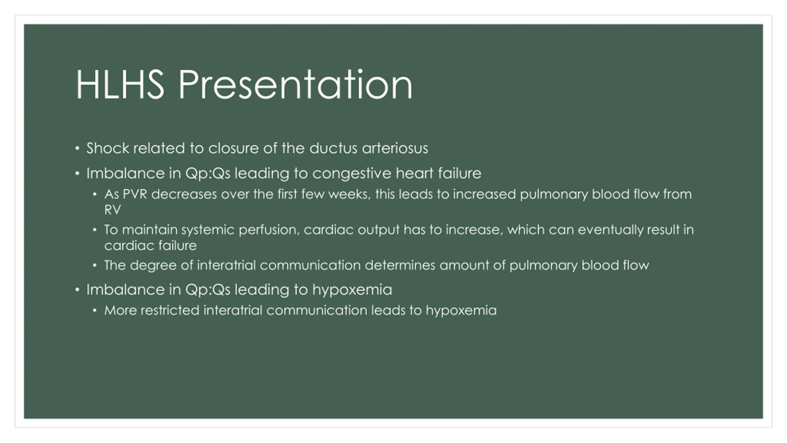 HLHS Presentation Shock related to closure of the ductus arteriosus Imbalance in Qp:Qs leading to congestive heart failure As PVR decreases over the first few weeks, this leads to increased pulmonary blood flow from RV To maintain systemic perfusion, cardiac output has to increase, which can eventually result in cardiac failure The degree of interatrial communication determines amount of pulmonary blood flow Imbalance in Qp:Qs leading to hypoxemia More restricted interatrial communication leads to hypoxemia