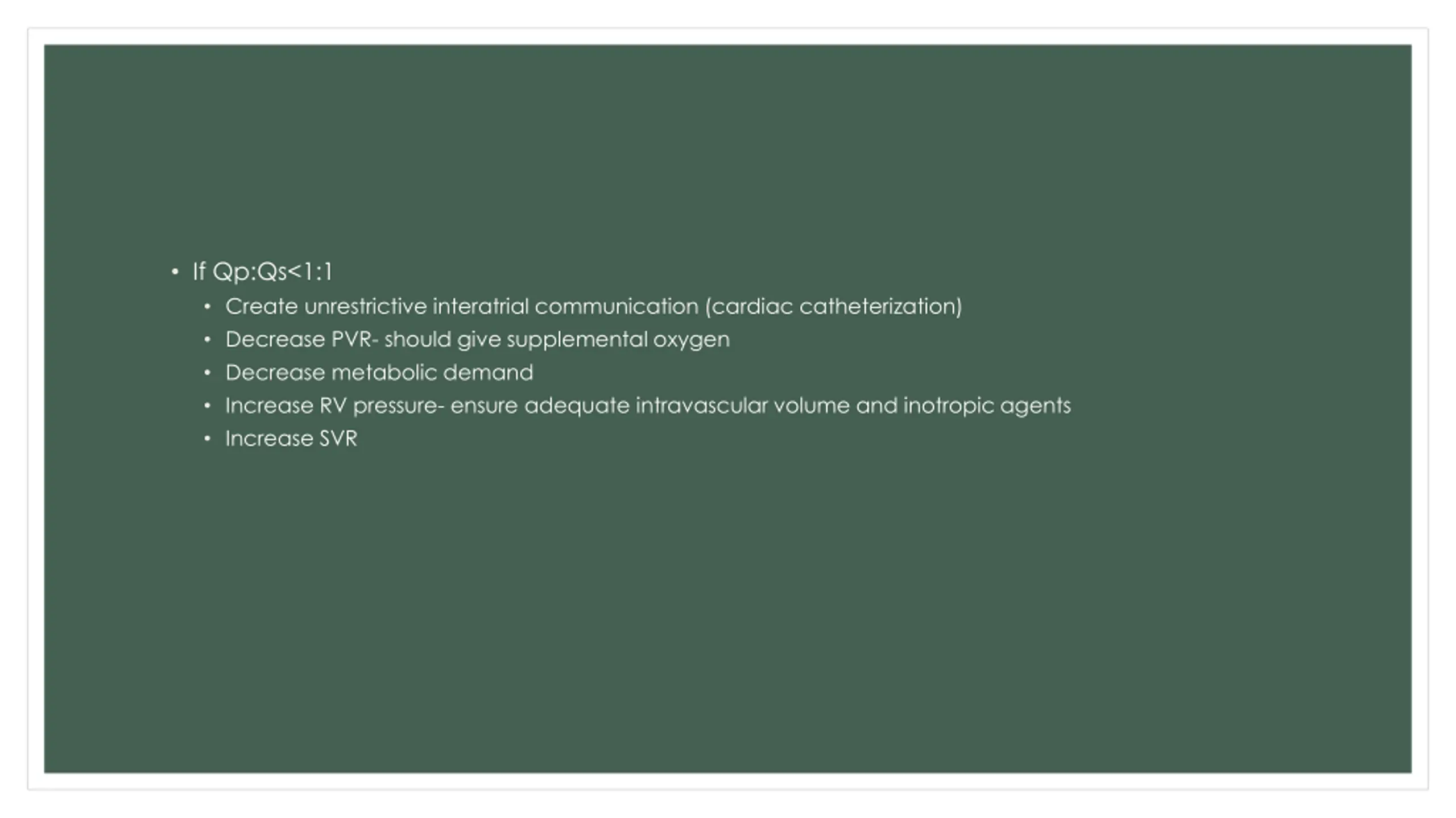 If Qp:Qs<1:1 Create unrestrictive interatrial communication (cardiac catheterization) Decrease PVR- should give supplemental oxygen Decrease metabolic demand Increase RV pressure- ensure adequate intravascular volume and inotropic agents Increase SVR