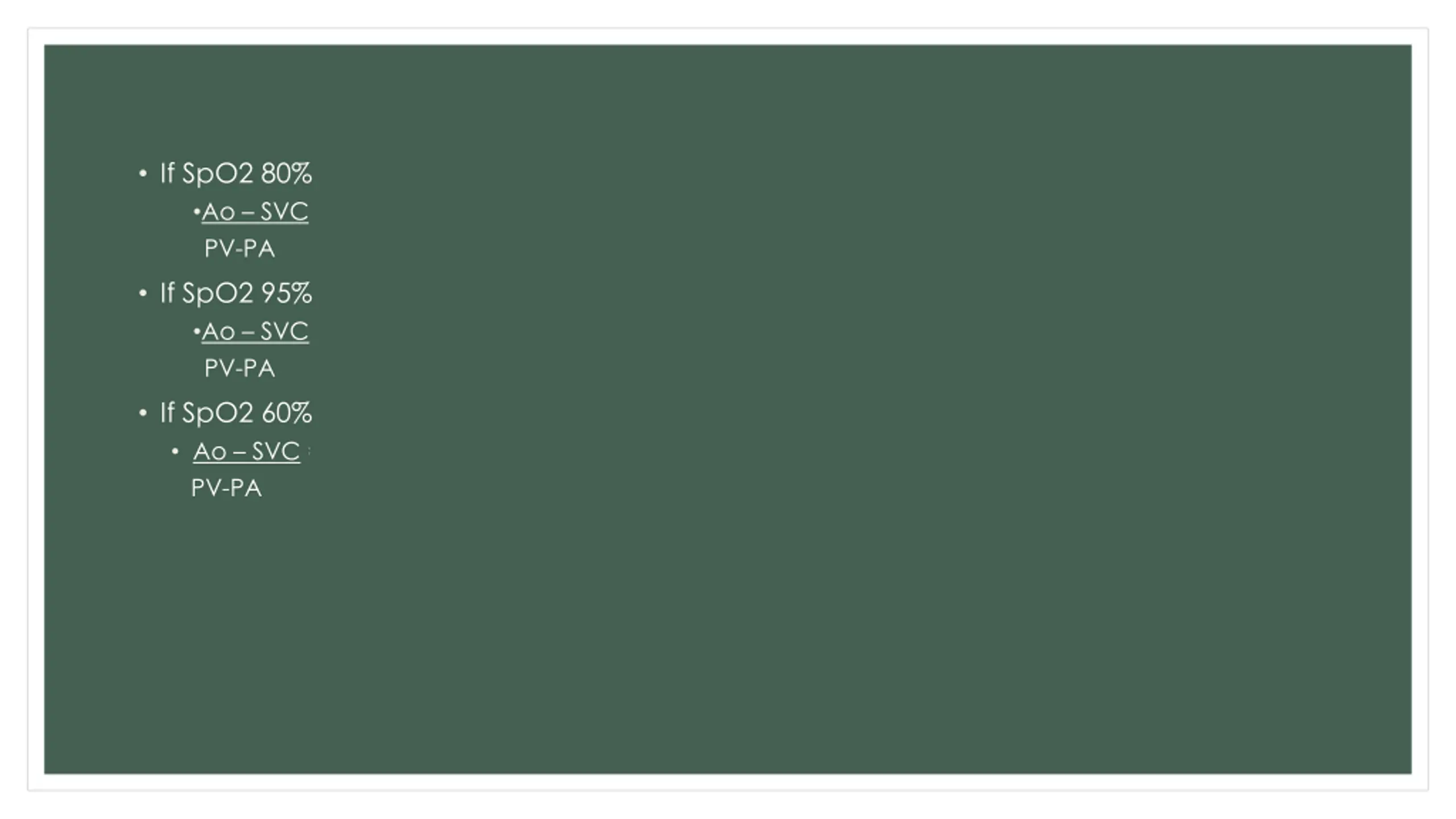 If SpO2 80% Ao SVC = 80-60 PV-PA If SpO2 95% Ao SVC = 95-75 PV-PA If SpO2 60% Ao SVC = 60-40 PV-PA = 20 Qp:Qs =1:1 20 100-80 = 20 Qp:Qs =4:1 5 100-95 = 20 Qp:Qs =1:2 40 100-60