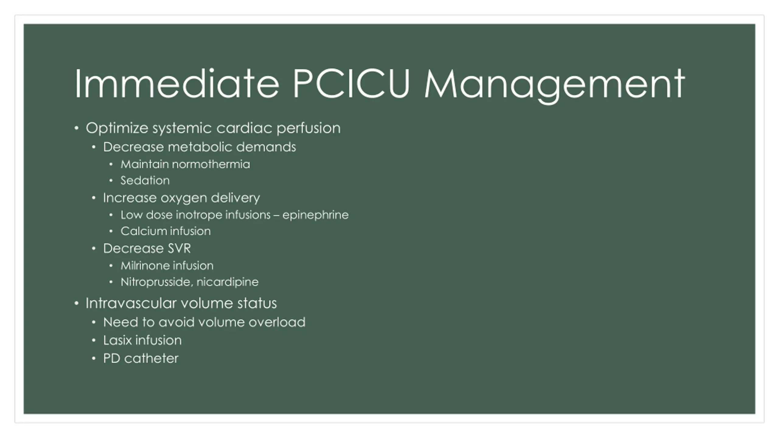 Immediate PCICU Management Optimize systemic cardiac perfusion Decrease metabolic demands Maintain normothermia Sedation Increase oxygen delivery Low dose inotrope infusions epinephrine Calcium infusion Decrease SVR Milrinone infusion Nitroprusside, nicardipine Intravascular volume status Need to avoid volume overload Lasix infusion PD catheter