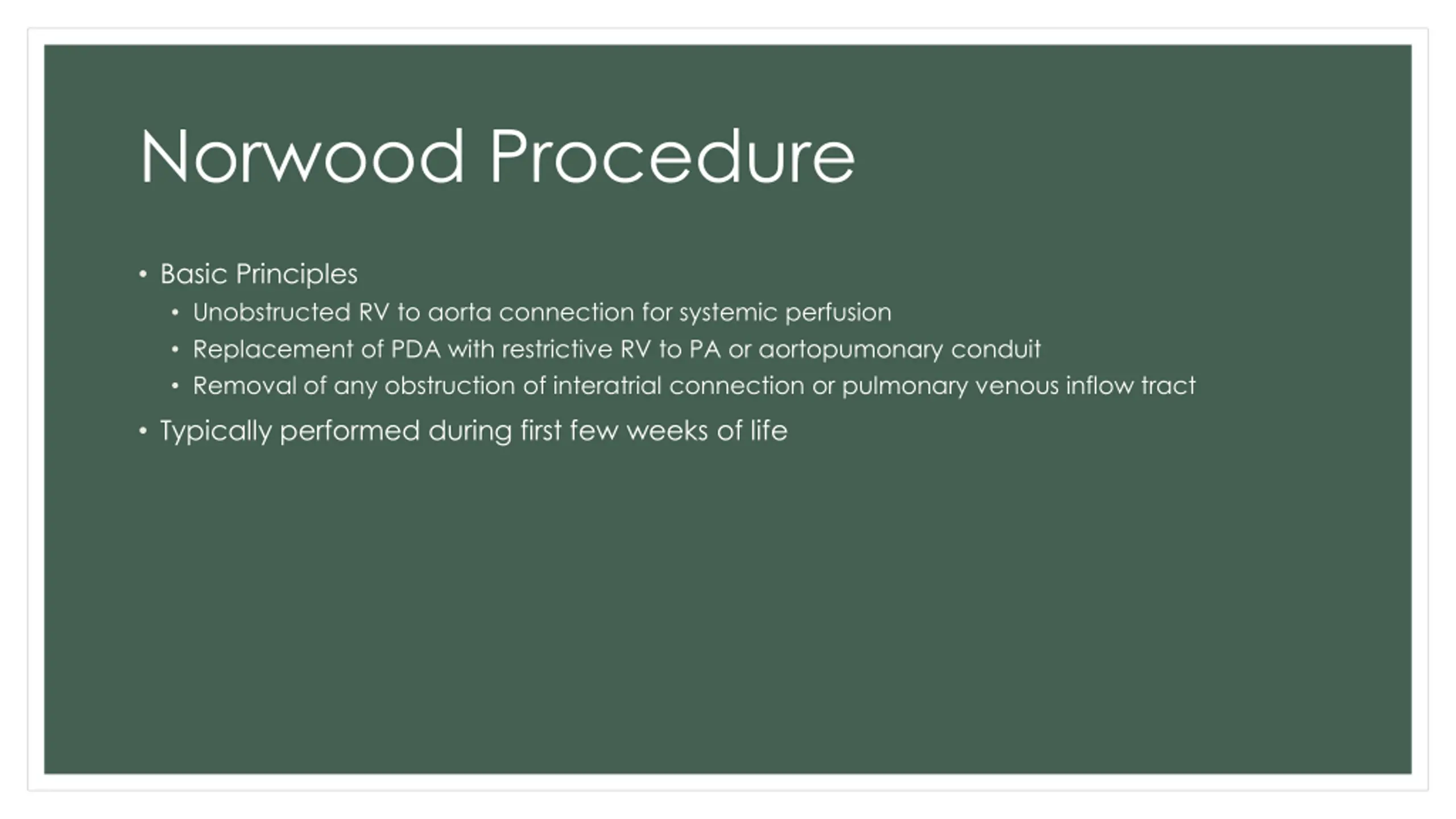Norwood Procedure Basic Principles Unobstructed RV to aorta connection for systemic perfusion Replacement of PDA with restrictive RV to PA or aortopumonary conduit Removal of any obstruction of interatrial connection or pulmonary venous inflow tract Typically performed during first few weeks of life