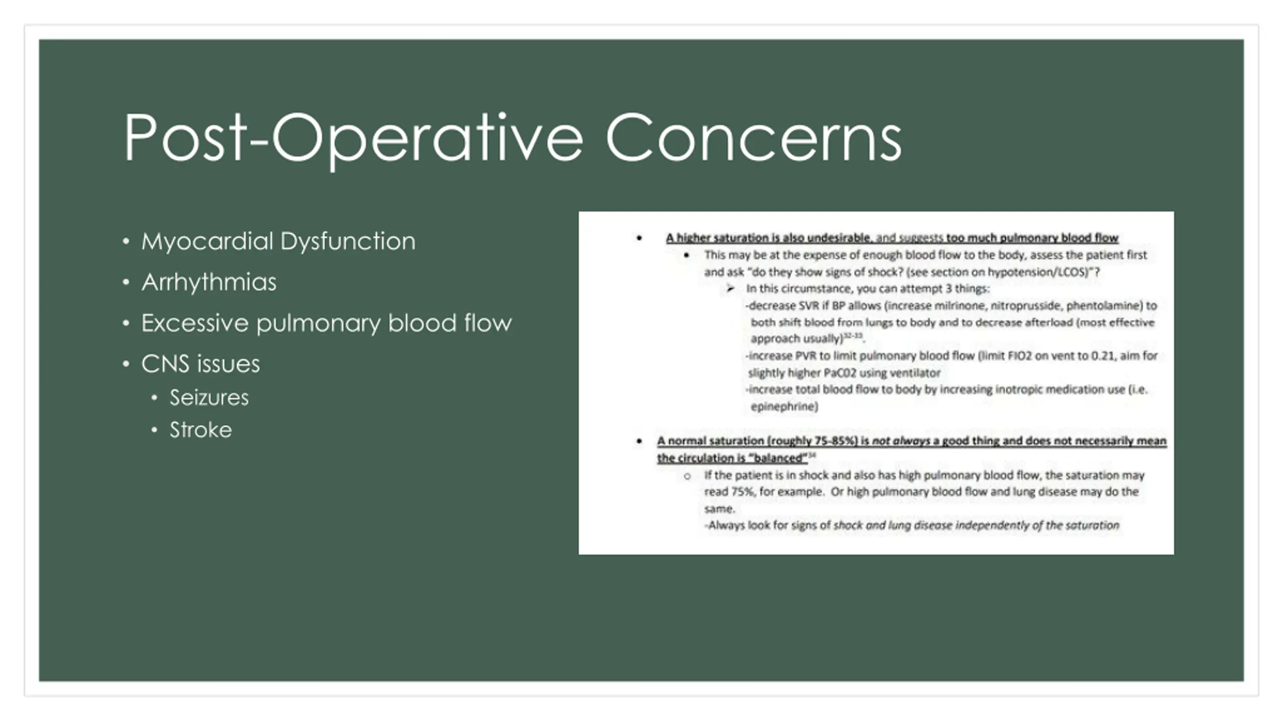 Post-Operative Concerns Myocardial Dysfunction Arrhythmias Excessive pulmonary blood flow CNS issues Seizures Stroke