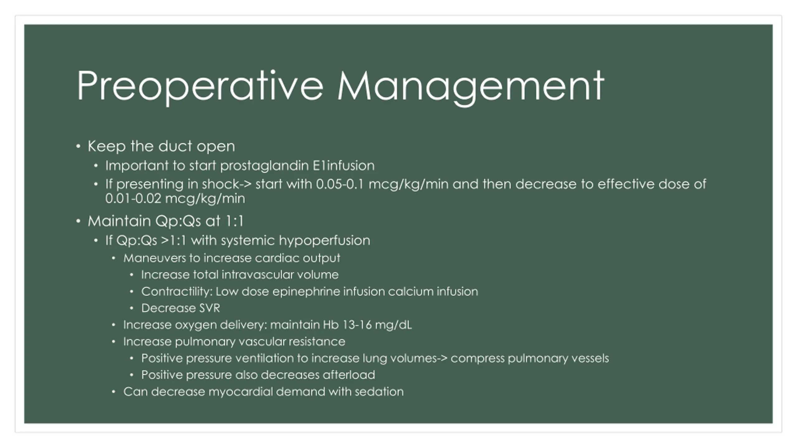 Preoperative Management Keep the duct open Important to start prostaglandin E1infusion If presenting in shock-> start with 0.05-0.1 mcg/kg/min and then decrease to effective dose of 0.01-0.02 mcg/kg/min Maintain Qp:Qs at 1:1 If Qp:Qs >1:1 with systemic hypoperfusion Maneuvers to increase cardiac output Increase total intravascular volume Contractility: Low dose epinephrine infusion calcium infusion Decrease SVR Increase oxygen delivery: maintain Hb 13-16 mg/dL Increase pulmonary vascular resistance Positive pressure ventilation to increase lung volumes-> compress pulmonary vessels Positive pressure also decreases afterload Can decrease myocardial demand with sedation