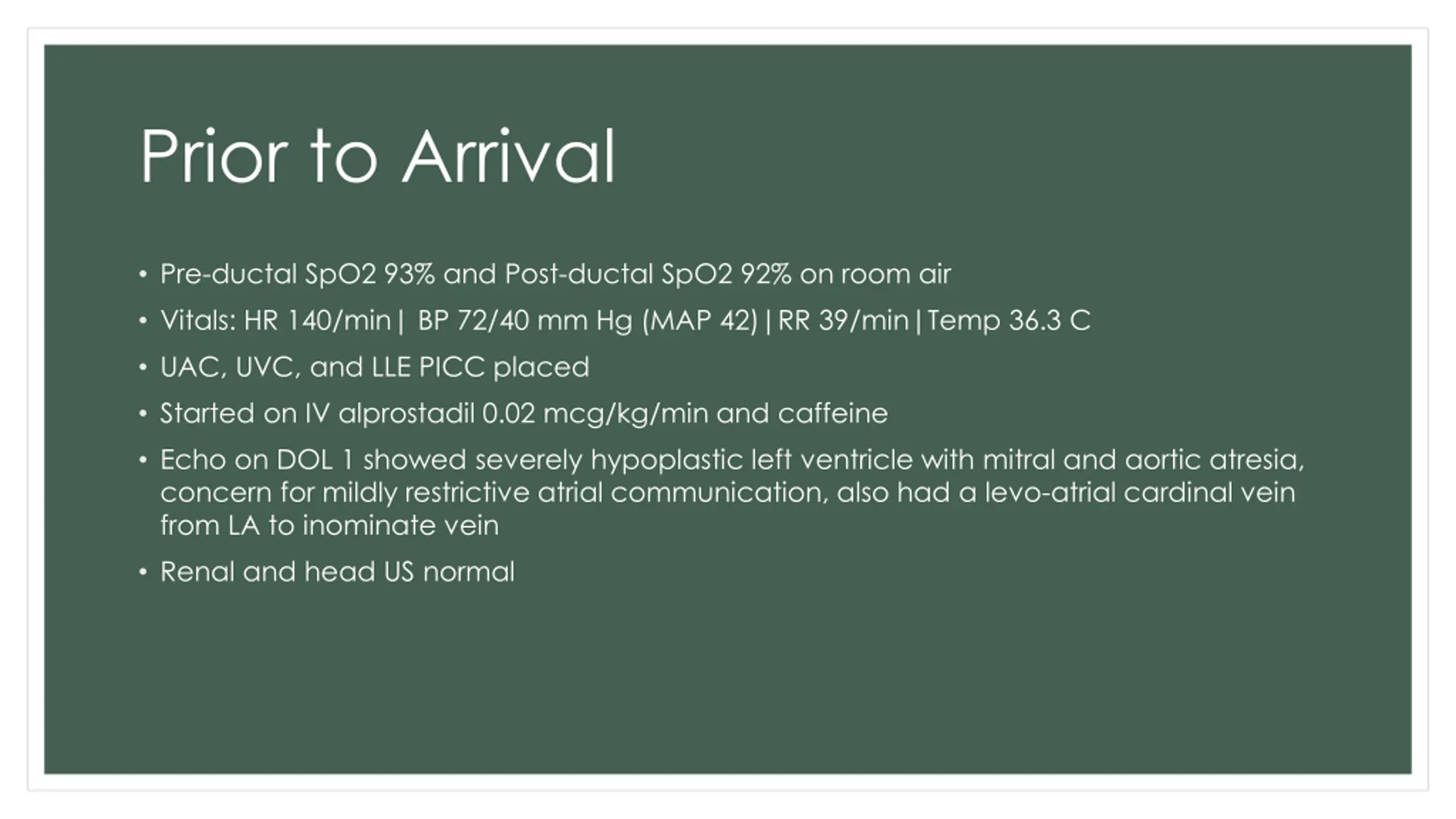 Prior to Arrival Pre-ductal SpO2 93% and Post-ductal SpO2 92% on room air Vitals: HR 140/min| BP 72/40 mm Hg (MAP 42)|RR 39/min|Temp 36.3 C UAC, UVC, and LLE PICC placed Started on IV alprostadil 0.02 mcg/kg/min and caffeine Echo on DOL 1 showed severely hypoplastic left ventricle with mitral and aortic atresia, concern for mildly restrictive atrial communication, also had a levo-atrial cardinal vein from LA to inominate vein Renal and head US normal