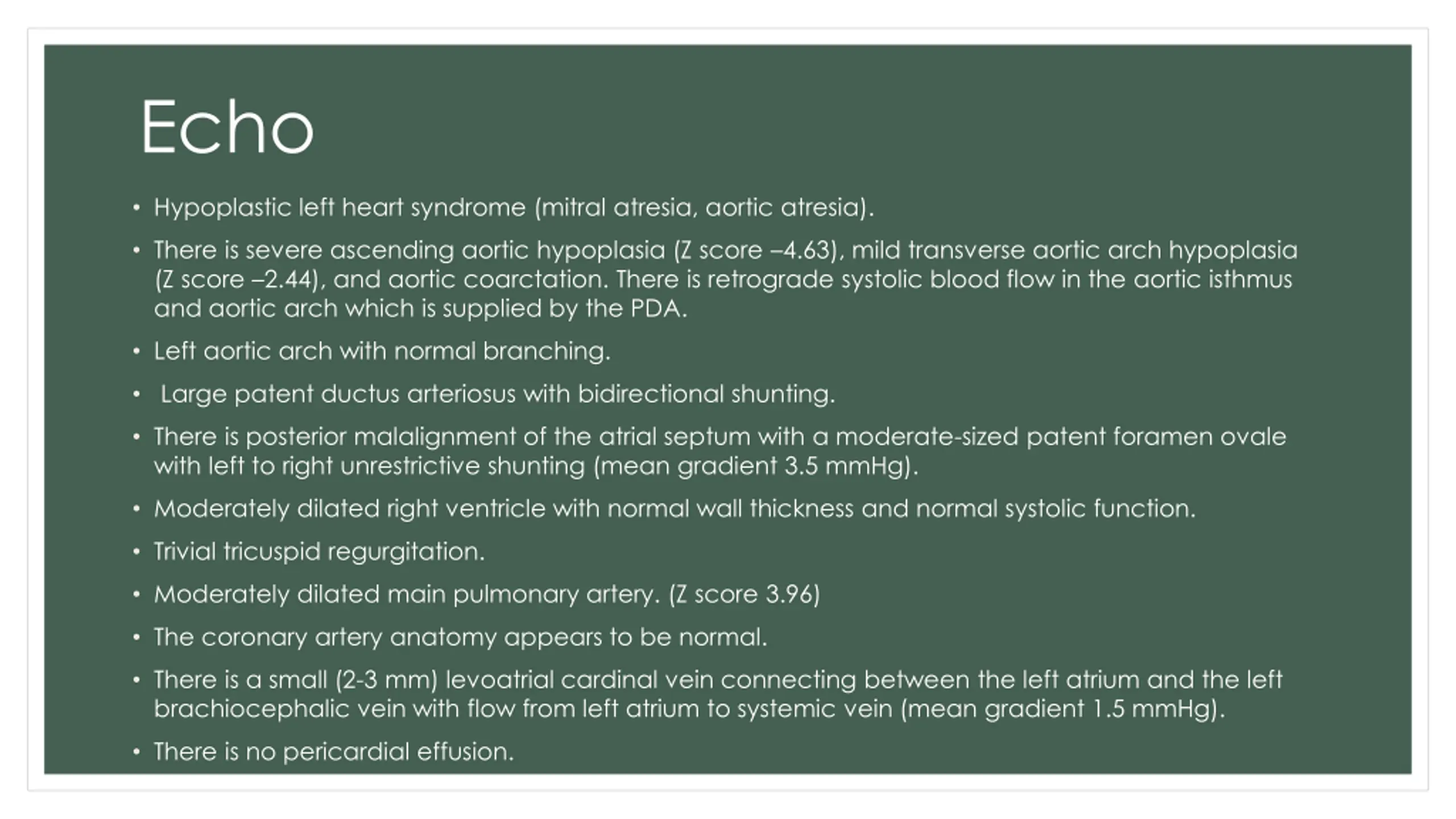 Echo Hypoplastic left heart syndrome (mitral atresia, aortic atresia). There is severe ascending aortic hypoplasia (Z score 4.63), mild transverse aortic arch hypoplasia (Z score 2.44), and aortic coarctation. There is retrograde systolic blood flow in the aortic isthmus and aortic arch which is supplied by the PDA. Left aortic arch with normal branching. Large patent ductus arteriosus with bidirectional shunting. There is posterior malalignment of the atrial septum with a moderate-sized patent foramen ovale with left to right unrestrictive shunting (mean gradient 3.5 mmHg). Moderately dilated right ventricle with normal wall thickness and normal systolic function. Trivial tricuspid regurgitation. Moderately dilated main pulmonary artery. (Z score 3.96) The coronary artery anatomy appears to be normal. There is a small (2-3 mm) levoatrial cardinal vein connecting between the left atrium and the left brachiocephalic vein with flow from left atrium to systemic vein (mean gradient 1.5 mmHg). There is no pericardial effusion.