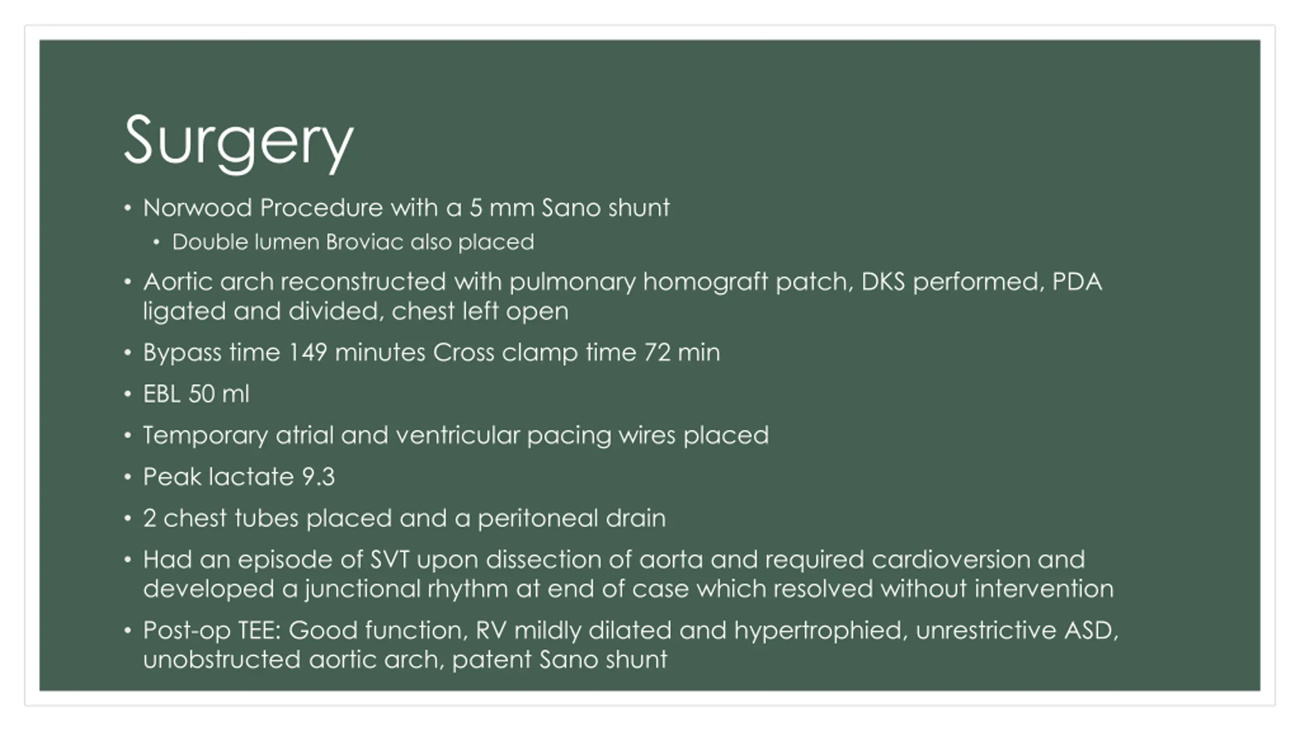 Surgery Norwood Procedure with a 5 mm Sano shunt Double lumen Broviac also placed Aortic arch reconstructed with pulmonary homograft patch, DKS performed, PDA ligated and divided, chest left open Bypass time 149 minutes Cross clamp time 72 min EBL 50 ml Temporary atrial and ventricular pacing wires placed Peak lactate 9.3 2 chest tubes placed and a peritoneal drain Had an episode of SVT upon dissection of aorta and required cardioversion and developed a junctional rhythm at end of case which resolved without intervention Post-op TEE: Good function, RV mildly dilated and hypertrophied, unrestrictive ASD, unobstructed aortic arch, patent Sano shunt