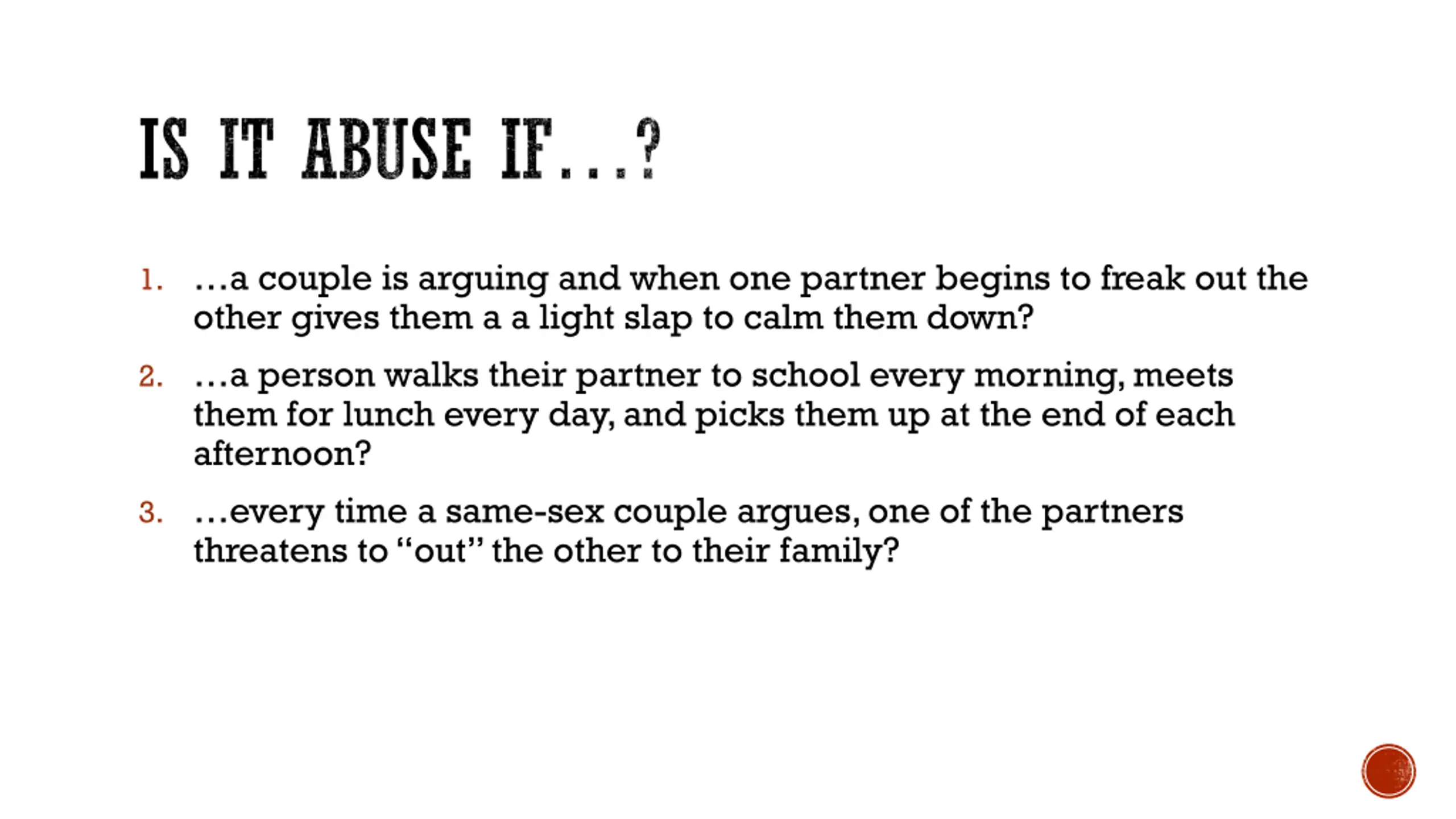 IS IT ABUSE IF? 1. a couple is arguing and when one partner begins to freak out the other gives them a a light slap to calm them down? 2. a person walks their partner to school every morning, meets them for lunch every day, and picks them up at the end of each afternoon? 3. every time a same-sex couple argues, one of the partners threatens to out the other to their family?
