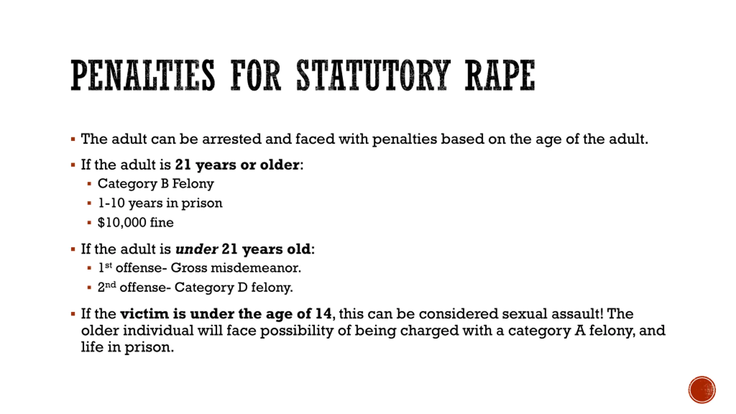 PENALTIES FOR STATUTORY RAPE The adult can be arrested and faced with penalties based on the age of the adult. If the adult is 21 years or older: Category B Felony 1-10 years in prison $10,000 fine If the adult is under 21 years old: 1st offense- Gross misdemeanor. 2nd offense- Category D felony. If the victim is under the age of 14, this can be considered sexual assault! The older individual will face possibility of being charged with a category A felony, and life in prison.
