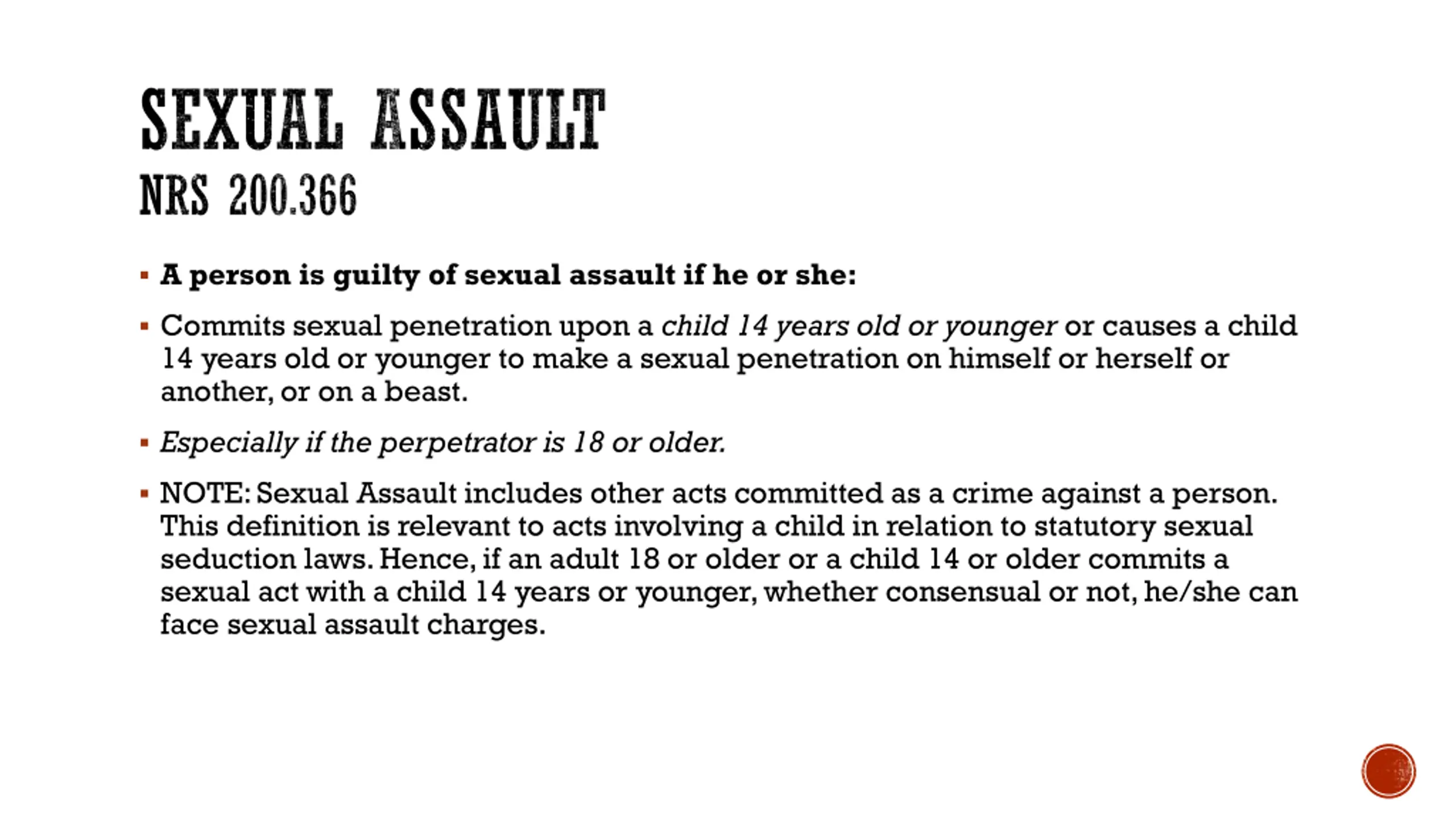 SEXUAL ASSAULT NRS 200.366 A person is guilty of sexual assault if he or she: Commits sexual penetration upon a child 14 years old or younger or causes a child 14 years old or younger to make a sexual penetration on himself or herself or another, or on a beast. Especially if the perpetrator is 18 or older. NOTE: Sexual Assault includes other acts committed as a crime against a person. This definition is relevant to acts involving a child in relation to statutory sexual seduction laws. Hence, if an adult 18 or older or a child 14 or older commits a sexual act with a child 14 years or younger, whether consensual or not, he/she can face sexual assault charges.