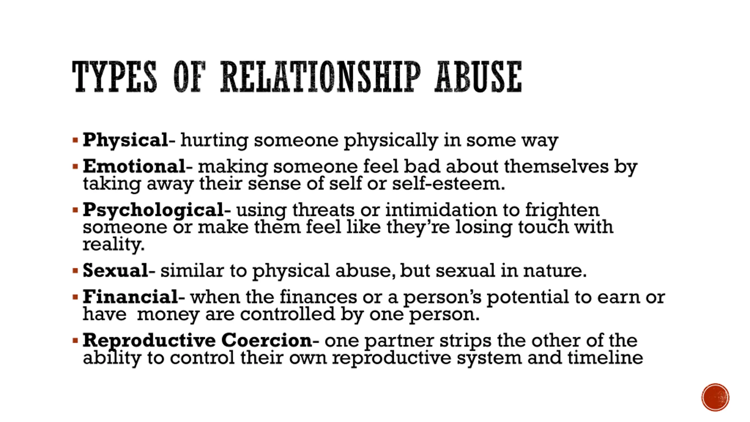 TYPES OF RELATIONSHIP ABUSE Physical- hurting someone physically in some way Emotional- making someone feel bad about themselves by taking away their sense of self or self-esteem. Psychological- using threats or intimidation to frighten someone or make them feel like they re losing touch with reality. Sexual- similar to physical abuse, but sexual in nature. Financial- when the finances or a person s potential to earn or have money are controlled by one person. Reproductive Coercion- one partner strips the other of the ability to control their own reproductive system and timeline