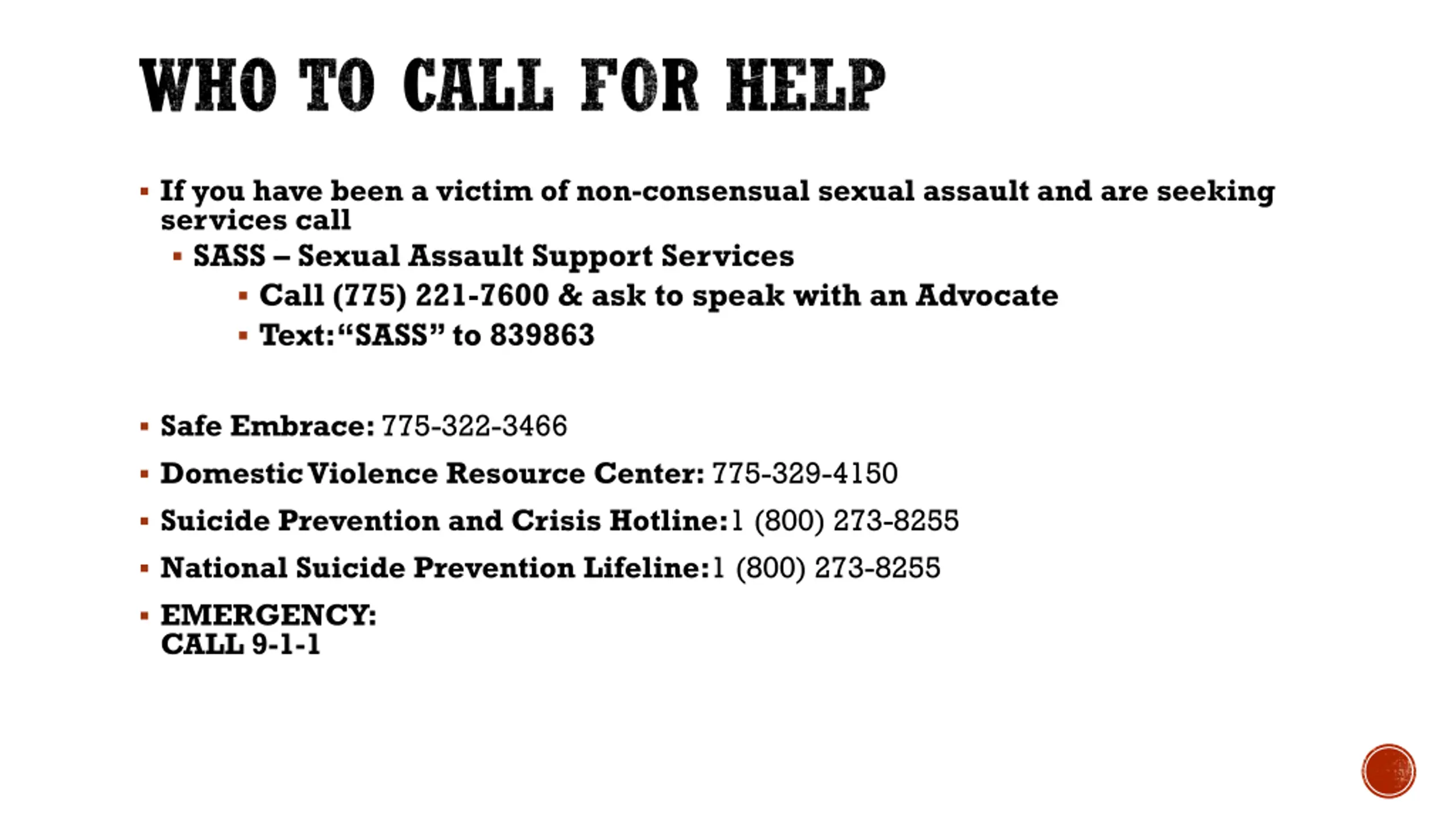 WHO TO CALL FOR HELP If you have been a victim of non-consensual sexual assault and are seeking services call SASS Sexual Assault Support Services Call (775) 221-7600 & ask to speak with an Advocate Text: SASS to 839863 Safe Embrace: 775-322-3466 Domestic Violence Resource Center: 775-329-4150 Suicide Prevention and Crisis Hotline:1 (800) 273-8255 National Suicide Prevention Lifeline:1 (800) 273-8255 EMERGENCY: CALL 9-1-1