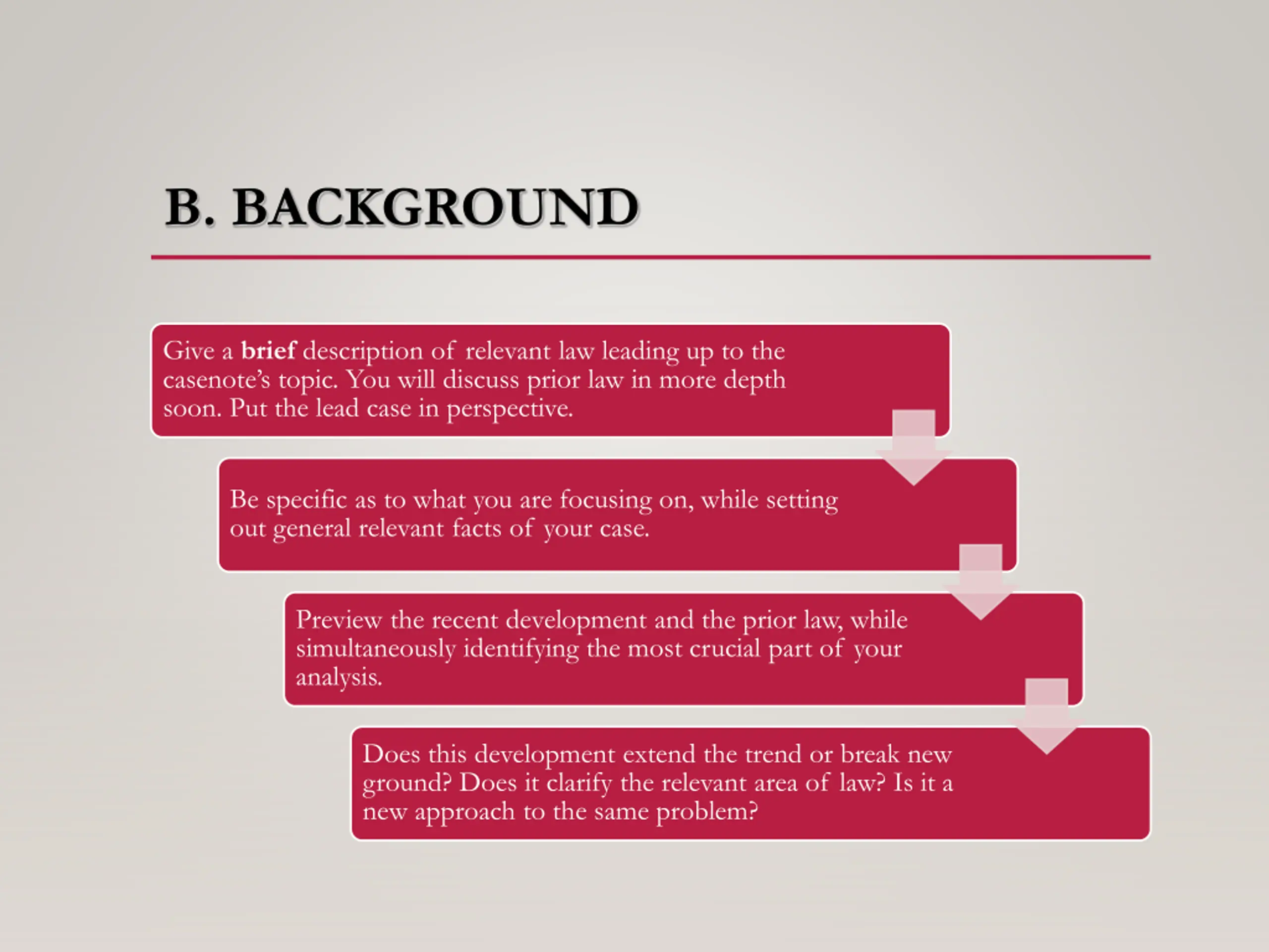 B. BACKGROUND Give a brief description of relevant law leading up to the casenote s topic. You will discuss prior law in more depth soon. Put the lead case in perspective. Be specific as to what you are focusing on, while setting out general relevant facts of your case. Preview the recent development and the prior law, while simultaneously identifying the most crucial part of your analysis. Does this development extend the trend or break new ground? Does it clarify the relevant area of law? Is it a new approach to the same problem?