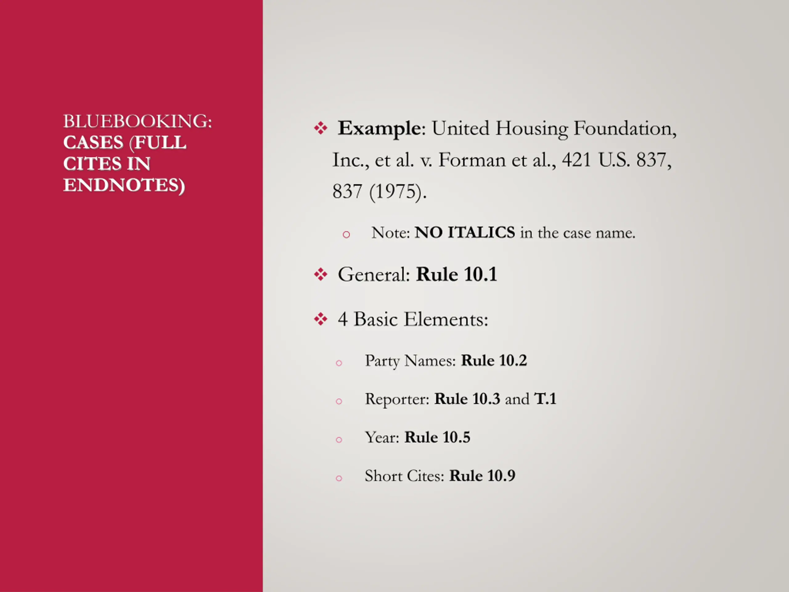 BLUEBOOKING: CASES (FULL CITES IN ENDNOTES) Example: United Housing Foundation, Inc., et al. v. Forman et al., 421 U.S. 837, 837 (1975). Note: NO ITALICS in the case name. o General: Rule 10.1 4 Basic Elements: Party Names: Rule 10.2 o Reporter: Rule 10.3 and T.1 o Year: Rule 10.5 o Short Cites: Rule 10.9 o