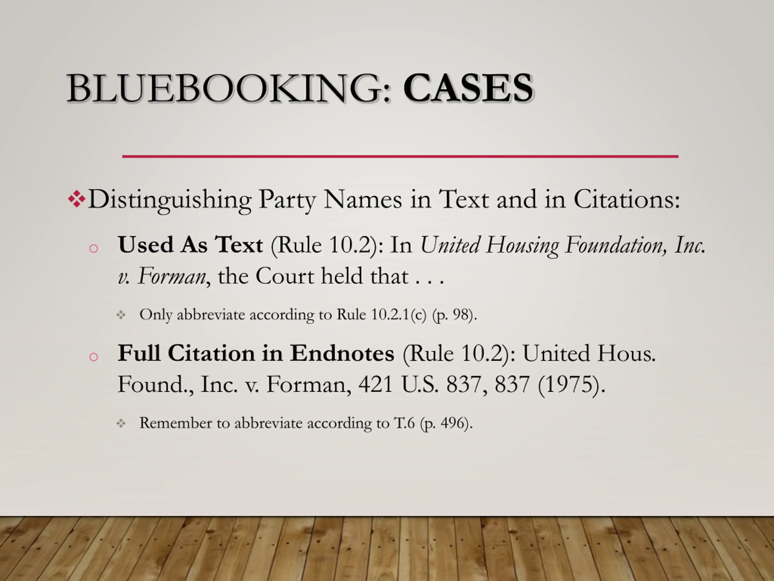 BLUEBOOKING: CASES Distinguishing Party Names in Text and in Citations: o Used As Text (Rule 10.2): In United Housing Foundation, Inc. v. Forman,the Court held that . . . Only abbreviate according to Rule 10.2.1(c) (p. 98). o Full Citation in Endnotes (Rule 10.2):United Hous. Found., Inc. v. Forman, 421 U.S. 837, 837 (1975). Remember to abbreviate according to T.6 (p. 496).