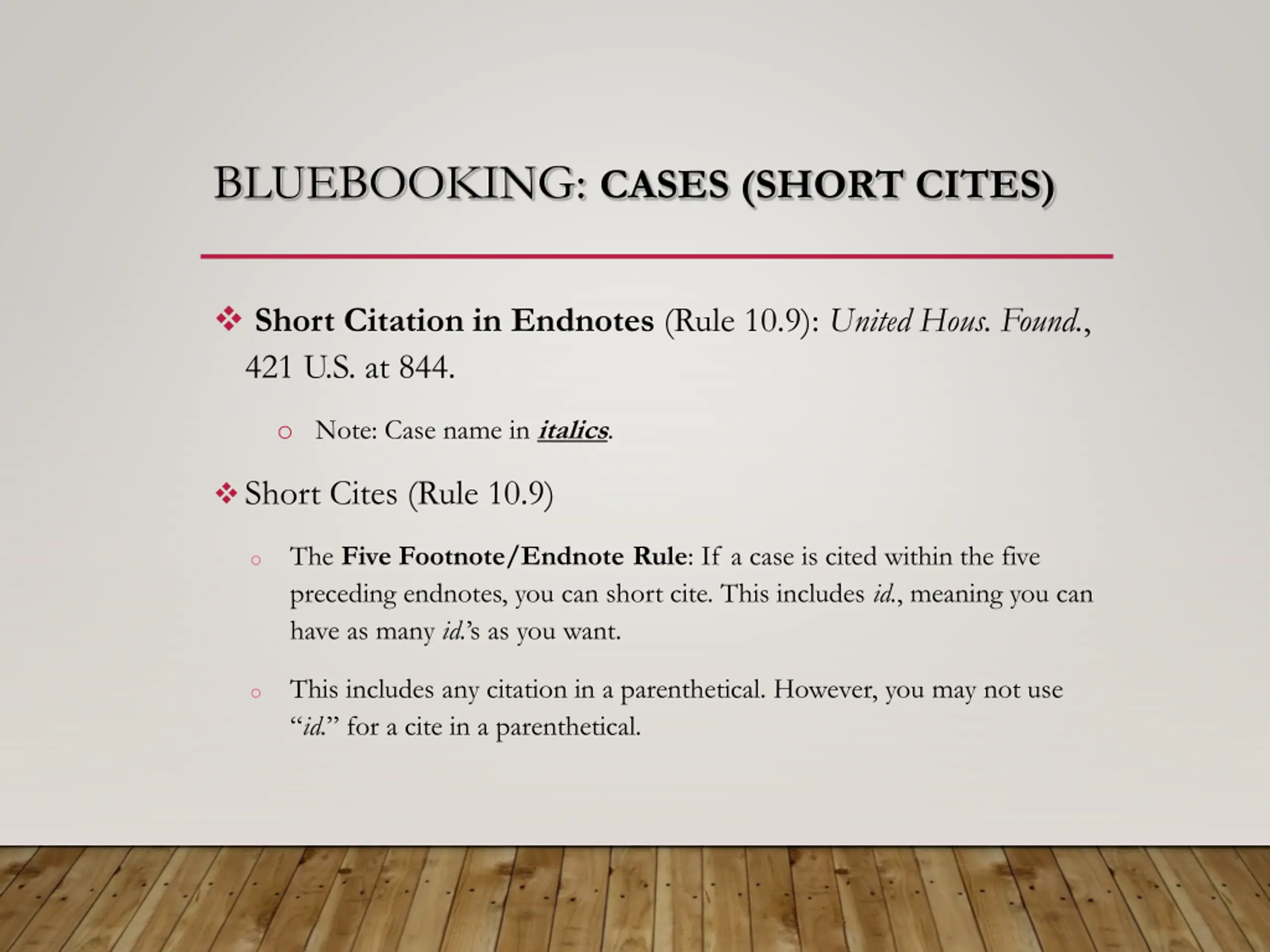BLUEBOOKING: CASES (SHORT CITES) Short Citation in Endnotes (Rule 10.9): United Hous. Found., 421 U.S. at 844. o Note: Case name in italics. Short Cites (Rule 10.9) The Five Footnote/Endnote Rule: If a case is cited within the five preceding endnotes, you can short cite. This includes id., meaning you can have as many id. s as you want. o This includes any citation in a parenthetical. However, you may not use id. for a cite in a parenthetical. o