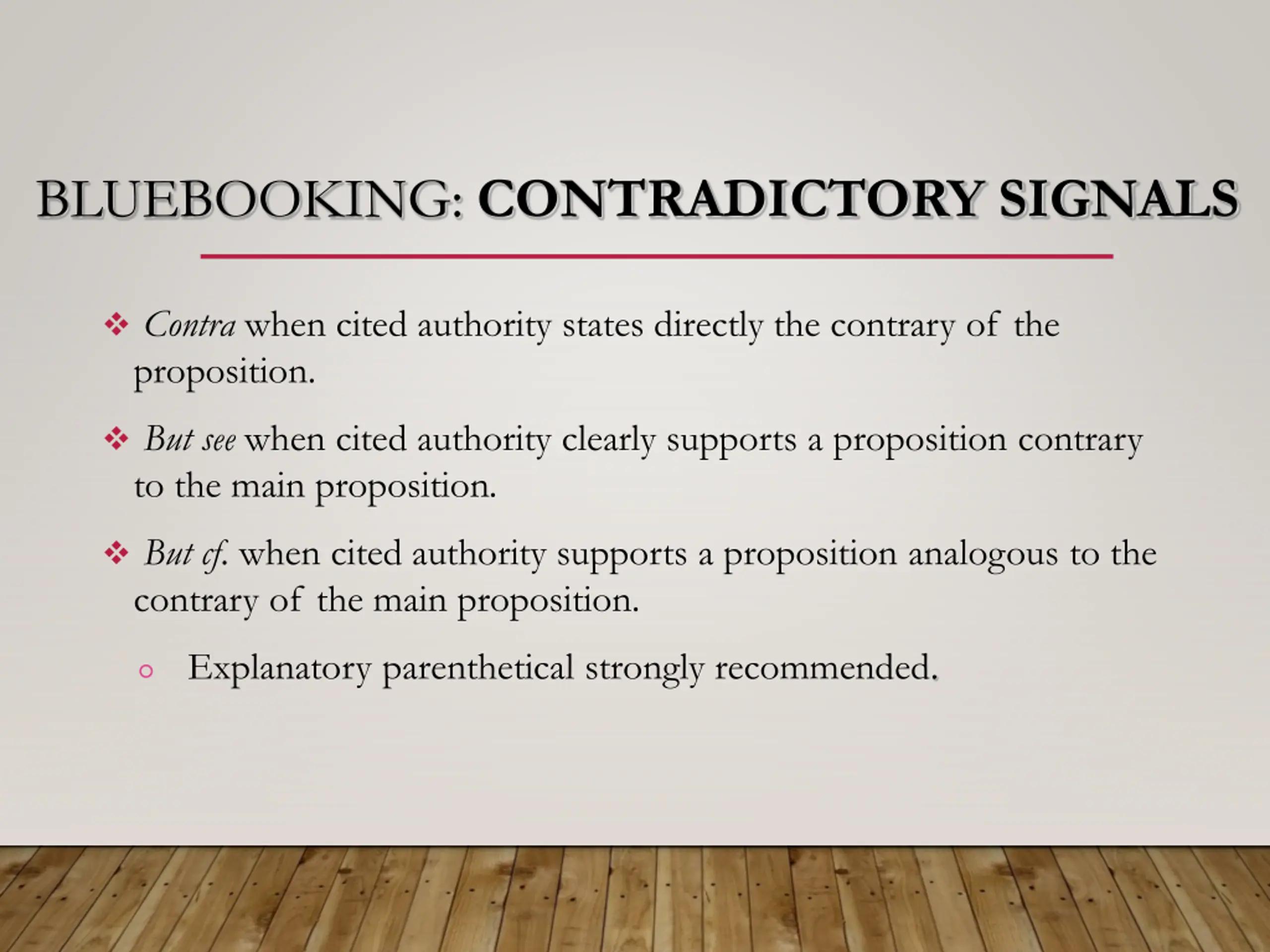 BLUEBOOKING: CONTRADICTORY SIGNALS Contra when cited authority states directly the contrary of the proposition. But see when cited authority clearly supports a proposition contrary to the main proposition. But cf. when cited authority supports a proposition analogous to the contrary of the main proposition. Explanatory parenthetical strongly recommended.