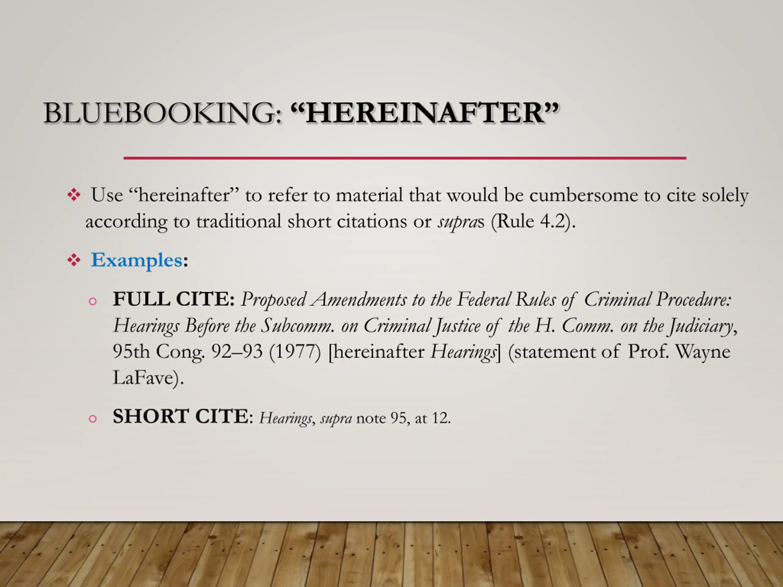 BLUEBOOKING: HEREINAFTER Use hereinafter to refer to material that would be cumbersome to cite solely according to traditional short citations or supras (Rule 4.2). Examples: FULL CITE: Proposed Amendments to the Federal Rules of Criminal Procedure: Hearings Before the Subcomm. on Criminal Justice of the H. Comm. on the Judiciary, 95th Cong. 92 93 (1977) [hereinafter Hearings] (statement of Prof. Wayne LaFave). SHORT CITE: Hearings, supra note 95, at 12.