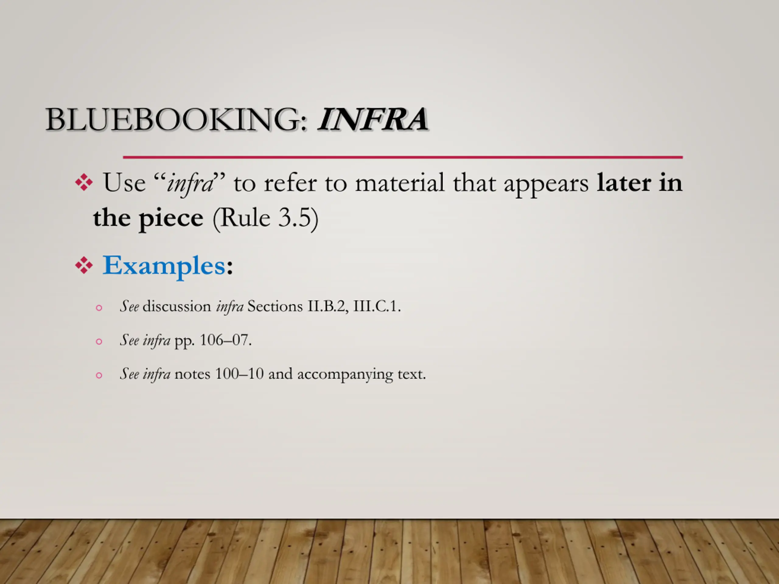 BLUEBOOKING: INFRA Use infra to refer to material that appears later in the piece (Rule 3.5) Examples: See discussion infra Sections II.B.2, III.C.1. Seeinfra pp. 106 07. Seeinfra notes 100 10 and accompanying text.