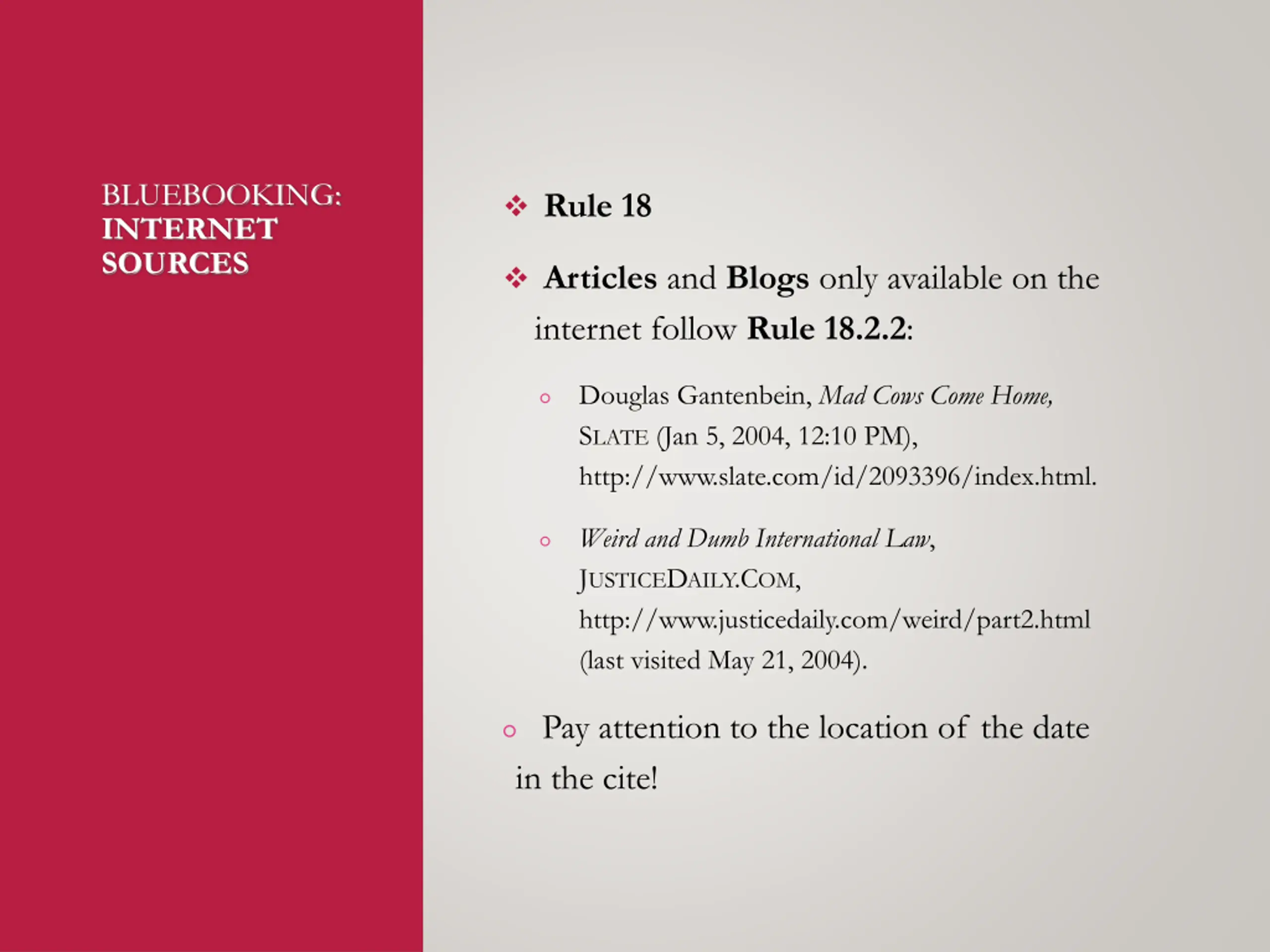 BLUEBOOKING: INTERNET SOURCES Rule 18 Articles and Blogs only available on the internet follow Rule 18.2.2: Douglas Gantenbein, Mad Cows Come Home, SLATE (Jan 5, 2004, 12:10 PM), http://www.slate.com/id/2093396/index.html. Weird and Dumb International Law, JUSTICEDAILY.COM, http://www.justicedaily.com/weird/part2.html (last visited May 21, 2004). Pay attention to the location of the date in the cite!