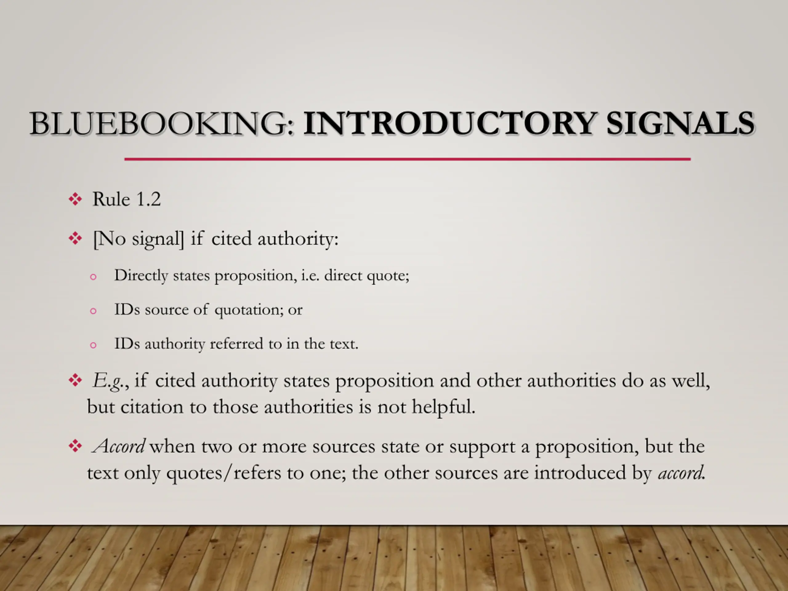 BLUEBOOKING: INTRODUCTORY SIGNALS Rule 1.2 [No signal] if cited authority: Directly states proposition, i.e. direct quote; IDs source of quotation; or IDs authority referred to in the text. E.g., if cited authority states proposition and other authorities do as well, but citation to those authorities is not helpful. Accord when two or more sources state or support a proposition, but the text only quotes/refers to one; the other sources are introduced by accord.