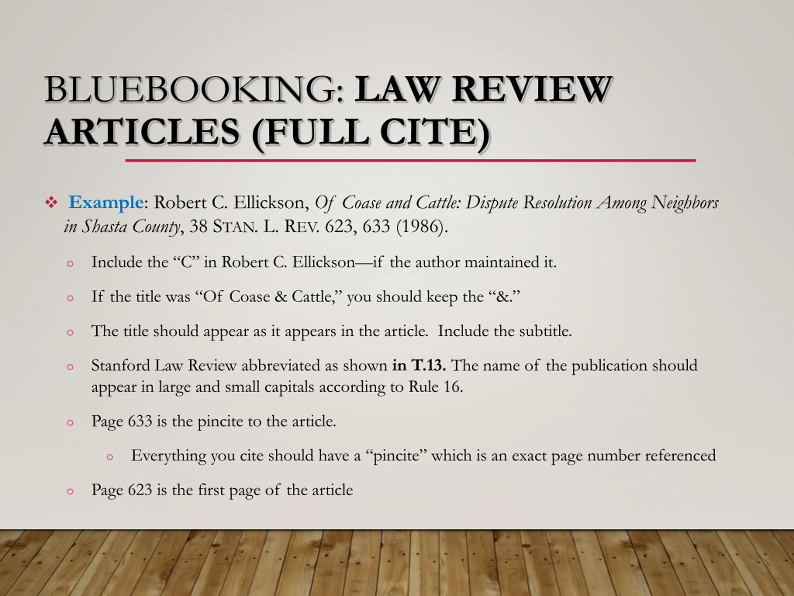 BLUEBOOKING: LAW REVIEW ARTICLES (FULL CITE) Example: Robert C. Ellickson, Of Coase and Cattle: Dispute Resolution Among Neighbors in Shasta County, 38 STAN. L. REV. 623, 633 (1986). Include the C in Robert C. Ellickson if the author maintained it. If the title was Of Coase & Cattle, you should keep the &. The title should appear as it appears in the article. Include the subtitle. Stanford Law Review abbreviated as shown in T.13. The name of the publication should appear in large and small capitals according to Rule 16. Page 633 is the pincite to the article. Everything you cite should have a pincite which is an exact page number referenced Page 623 is the first page of the article
