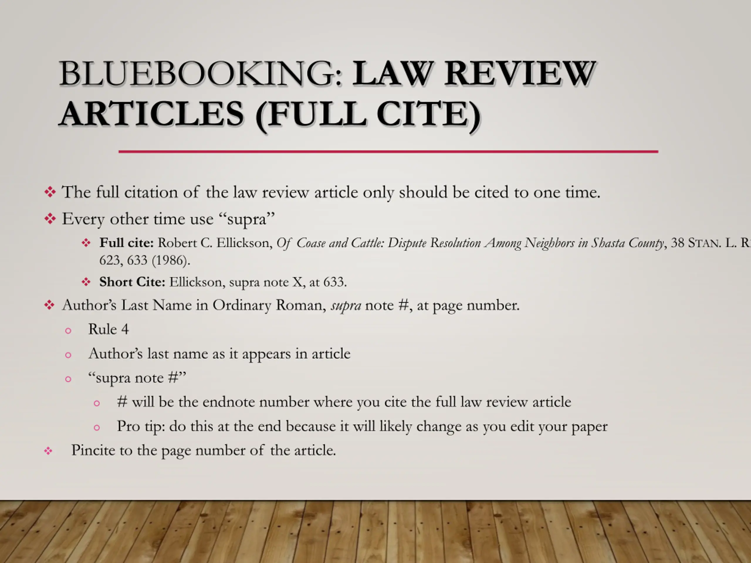 BLUEBOOKING: LAW REVIEW ARTICLES (FULL CITE) The full citation of the law review article only should be cited to one time. Every other time use supra Full cite: Robert C. Ellickson, Of Coase and Cattle: Dispute Resolution Among Neighbors in Shasta County, 38 STAN. L. REV 623, 633 (1986). Short Cite: Ellickson, supra note X, at 633. Author s Last Name in Ordinary Roman, supra note #, at page number. Rule 4 Author s last name as it appears in article supra note # # will be the endnote number where you cite the full law review article Pro tip: do this at the end because it will likely change as you edit your paper Pincite to the page number of the article.