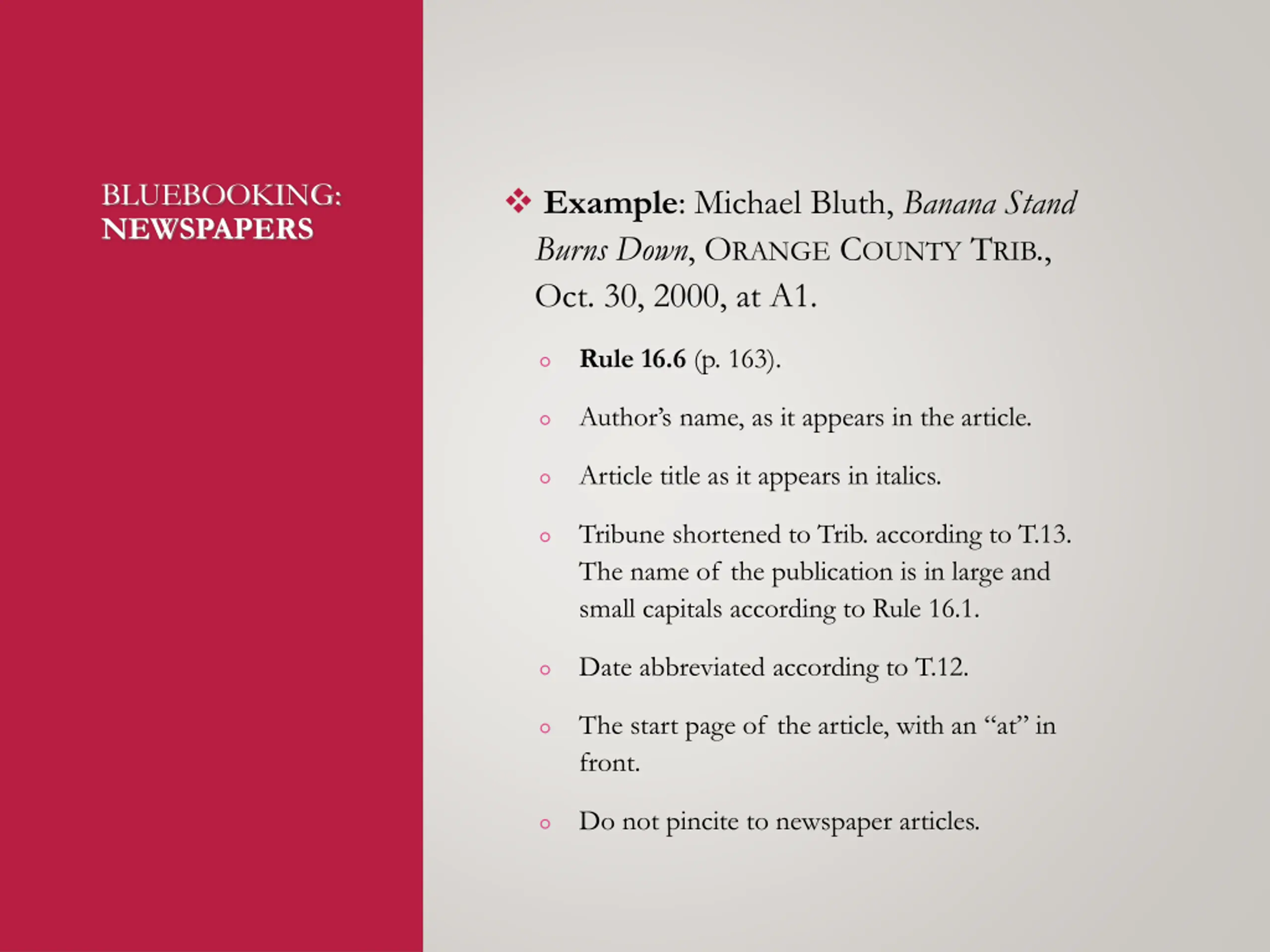 BLUEBOOKING: NEWSPAPERS Example: Michael Bluth, Banana Stand Burns Down,ORANGE COUNTY TRIB., Oct. 30, 2000, at A1. Rule 16.6 (p. 163). Author s name, as it appears in the article. Article title as it appears in italics. Tribune shortened to Trib. according to T.13. The name of the publication is in large and small capitals according to Rule 16.1. Date abbreviated according to T.12. The start page of the article, with an at in front. Do not pincite to newspaper articles.