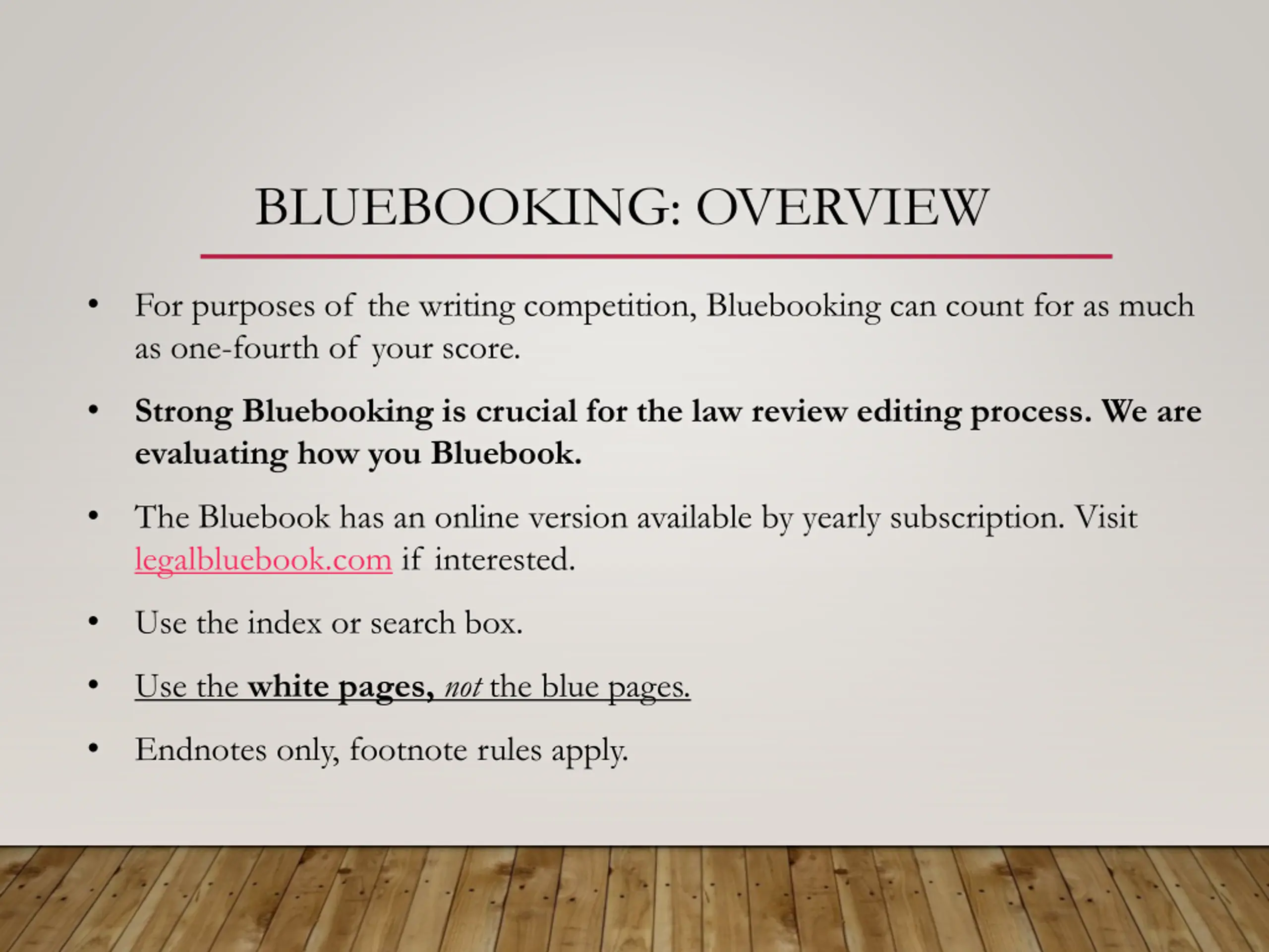 BLUEBOOKING: OVERVIEW For purposes of the writing competition, Bluebooking can count for as much as one-fourth of your score. Strong Bluebooking is crucial for the law review editing process. We are evaluating how you Bluebook. The Bluebook has an online version available by yearly subscription. Visit legalbluebook.com if interested. Use the index or search box. Use the white pages, not the blue pages. Endnotes only, footnote rules apply.