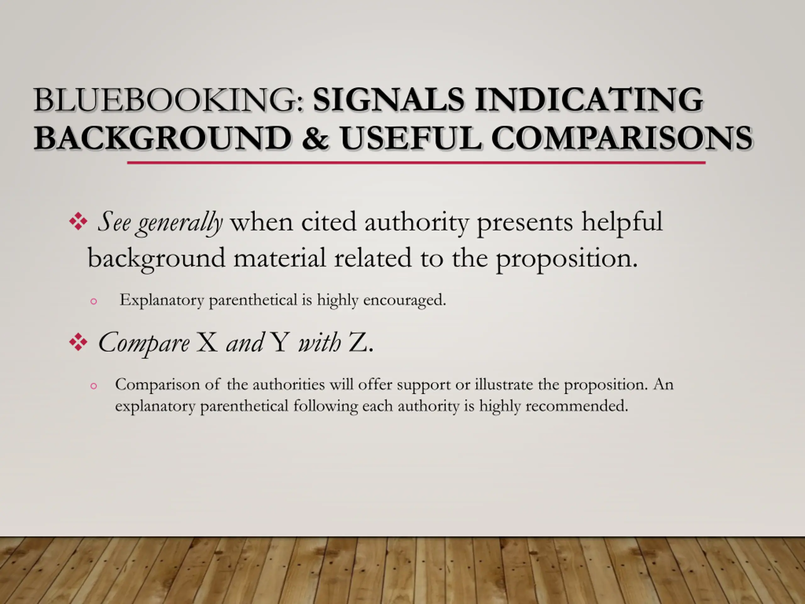BLUEBOOKING: SIGNALS INDICATING BACKGROUND & USEFUL COMPARISONS See generally when cited authority presents helpful background material related to the proposition. Explanatory parenthetical is highly encouraged. Compare X and Y with Z. Comparison of the authorities will offer support or illustrate the proposition. An explanatory parenthetical following each authority is highly recommended.