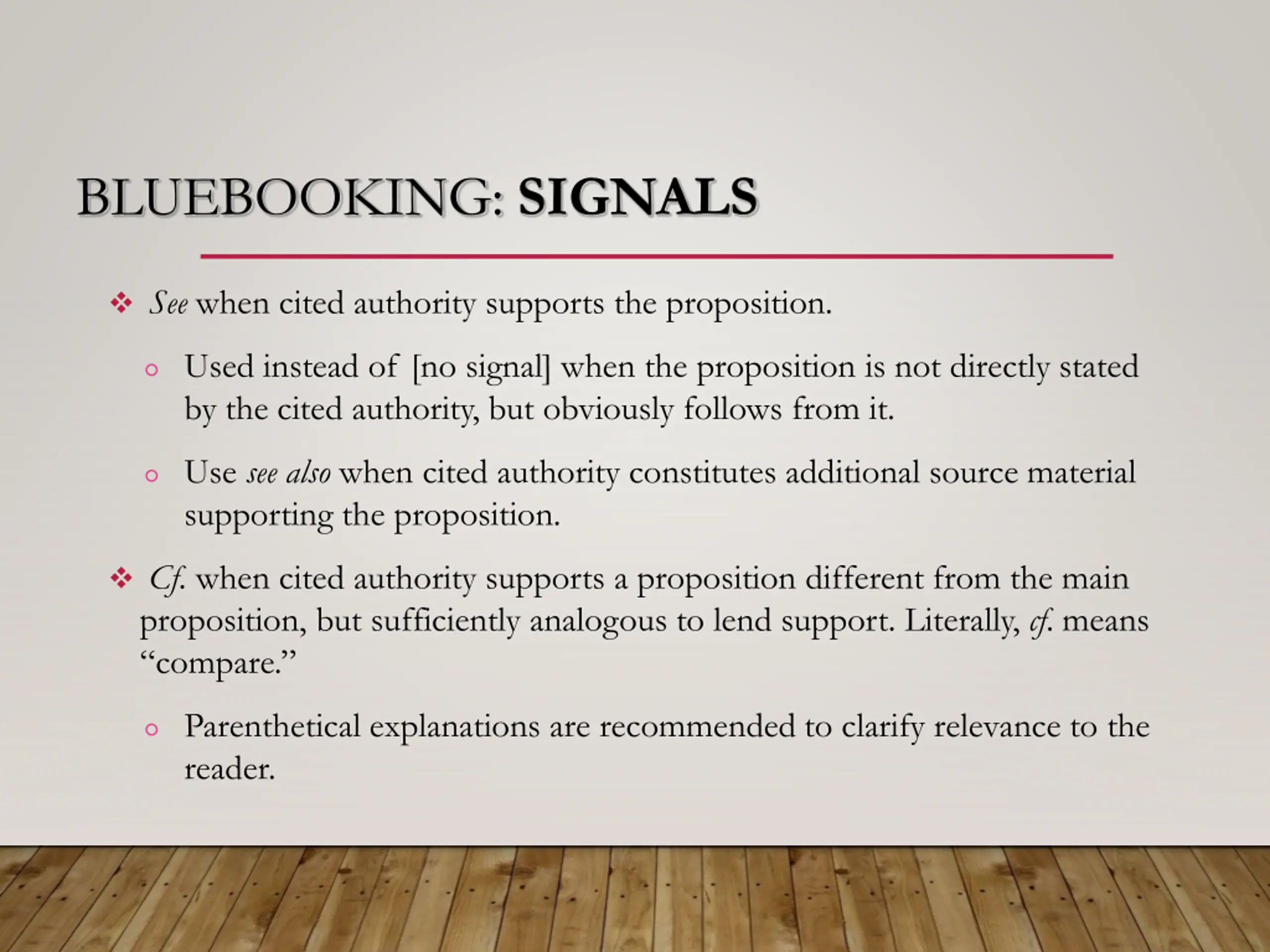 BLUEBOOKING: SIGNALS See when cited authority supports the proposition. Used instead of [no signal] when the proposition is not directly stated by the cited authority, but obviously follows from it. Use see also when cited authority constitutes additional source material supporting the proposition. Cf. when cited authority supports a proposition different from the main proposition, but sufficiently analogous to lend support. Literally, cf. means compare. Parenthetical explanations are recommended to clarify relevance to the reader.