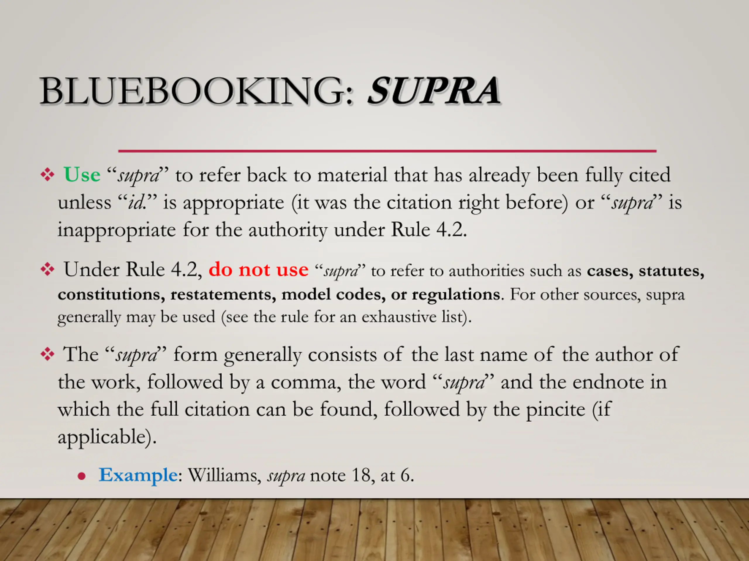 BLUEBOOKING: SUPRA Use supra to refer back to material that has already been fully cited unless id. is appropriate (it was the citation right before) or supra is inappropriate for the authority under Rule 4.2. Under Rule 4.2, do not use supra to refer to authorities such as cases, statutes, constitutions, restatements, model codes, or regulations. For other sources, supra generally may be used (seethe rule for an exhaustive list). The supra form generally consists of the last name of the author of the work, followed by a comma, the word supra and the endnote in which the full citation can be found, followed by the pincite (if applicable). Example: Williams, supra note 18, at 6.