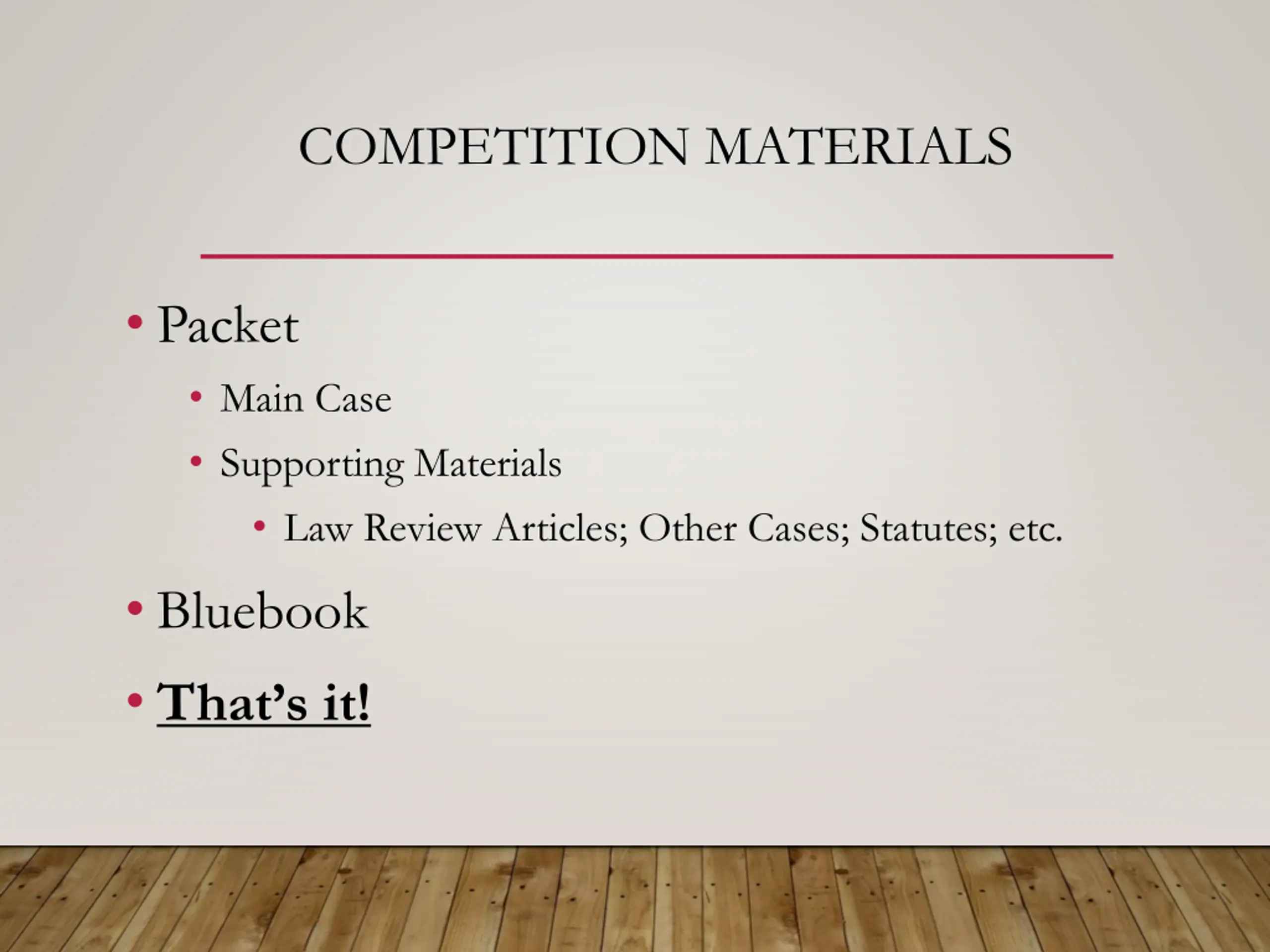 COMPETITION MATERIALS Packet Main Case Supporting Materials Law Review Articles; Other Cases; Statutes; etc. Bluebook That s it!