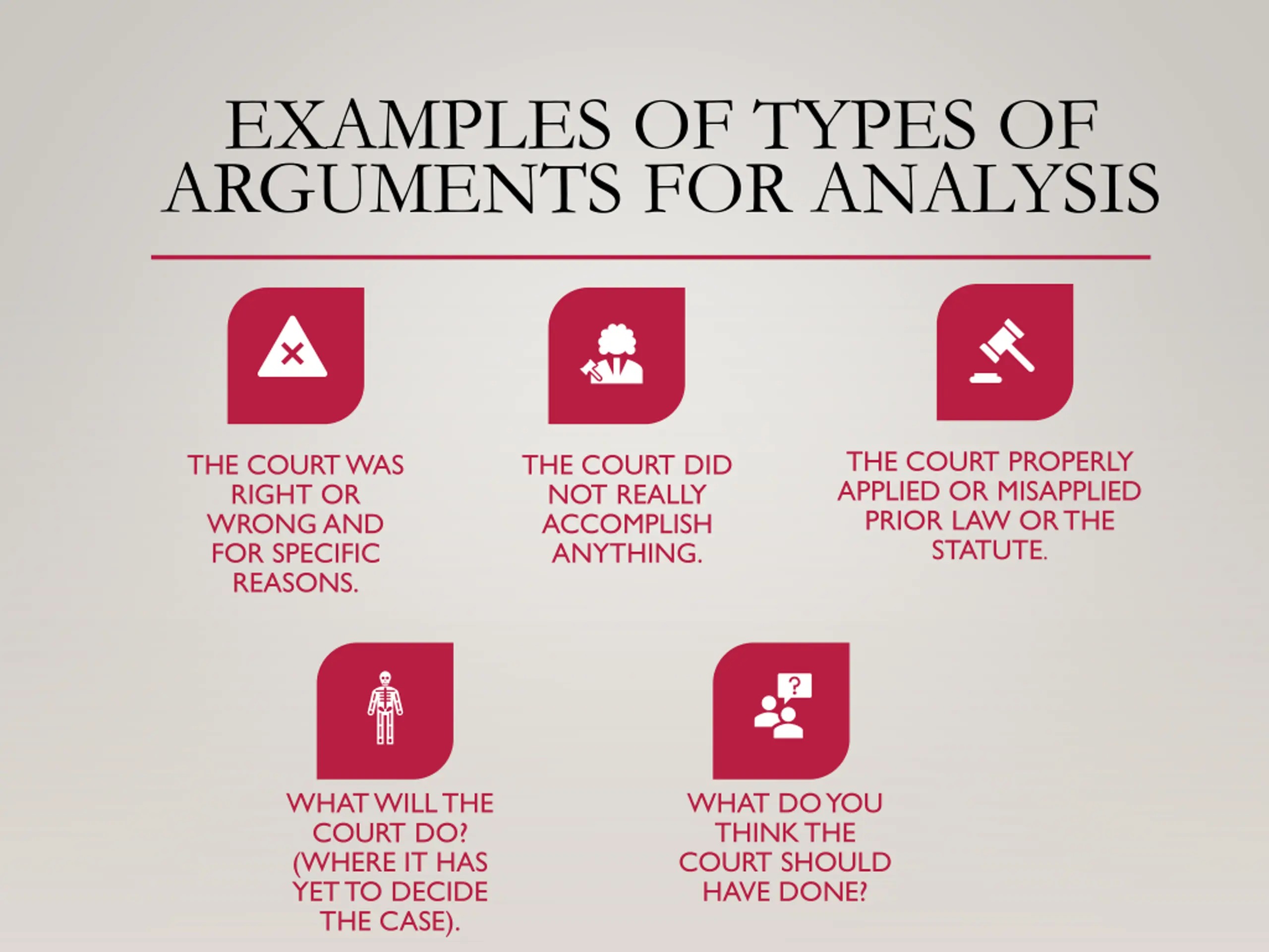 EXAMPLES OF TYPES OF ARGUMENTS FOR ANALYSIS THE COURT PROPERLY APPLIED OR MISAPPLIED PRIOR LAW OR THE STATUTE. THE COURT WAS RIGHT OR WRONG AND FOR SPECIFIC REASONS. THE COURT DID NOT REALLY ACCOMPLISH ANYTHING. WHAT DO YOU THINK THE COURT SHOULD HAVE DONE? WHAT WILL THE COURT DO? (WHERE IT HAS YET TO DECIDE THE CASE).
