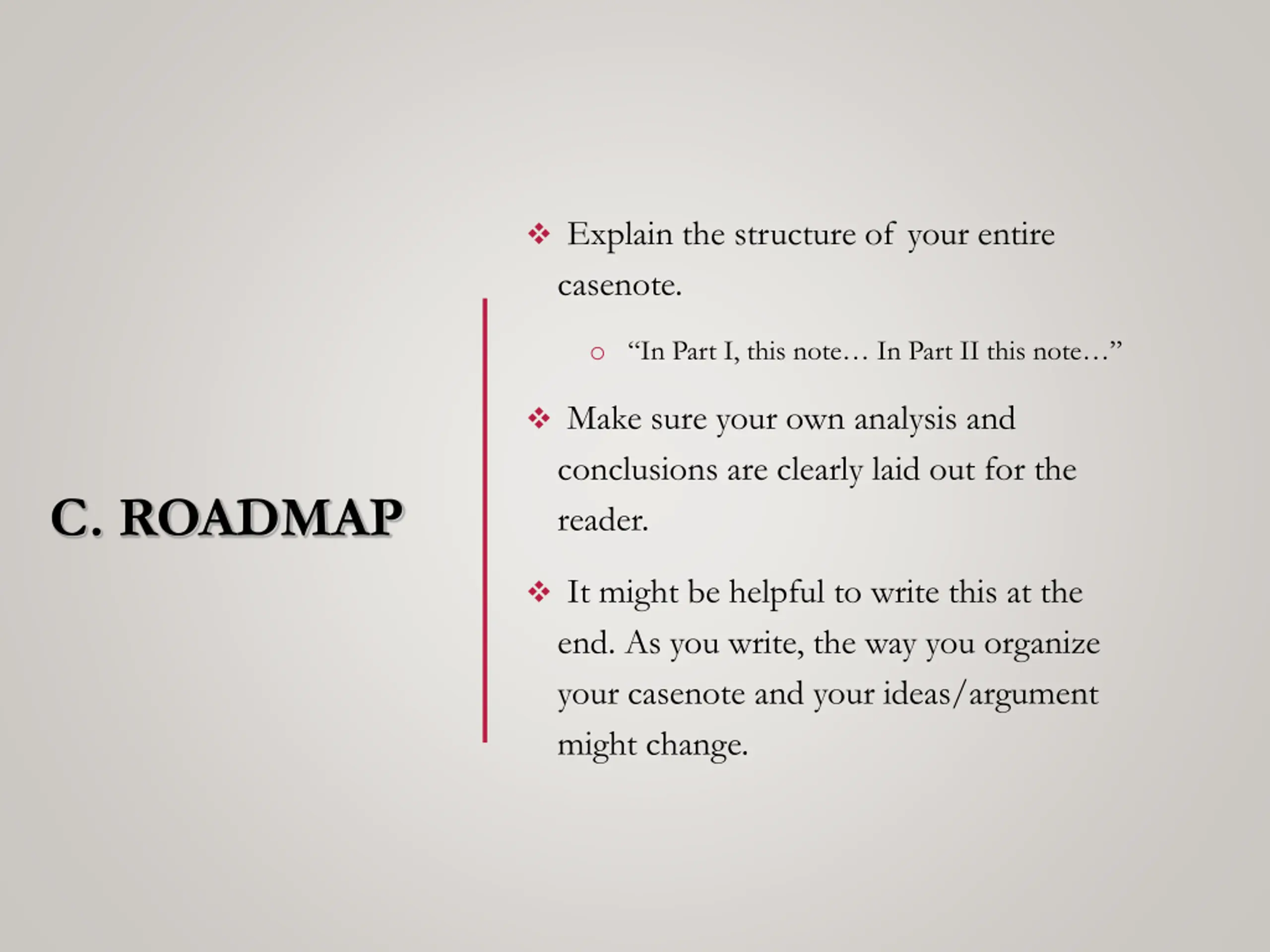 Explain the structure of your entire casenote. o In Part I, this note In Part II this note Make sure your own analysis and conclusions are clearly laid out for the reader. C. ROADMAP It might be helpful to write this at the end. As you write, the way you organize your casenote and your ideas/argument might change.