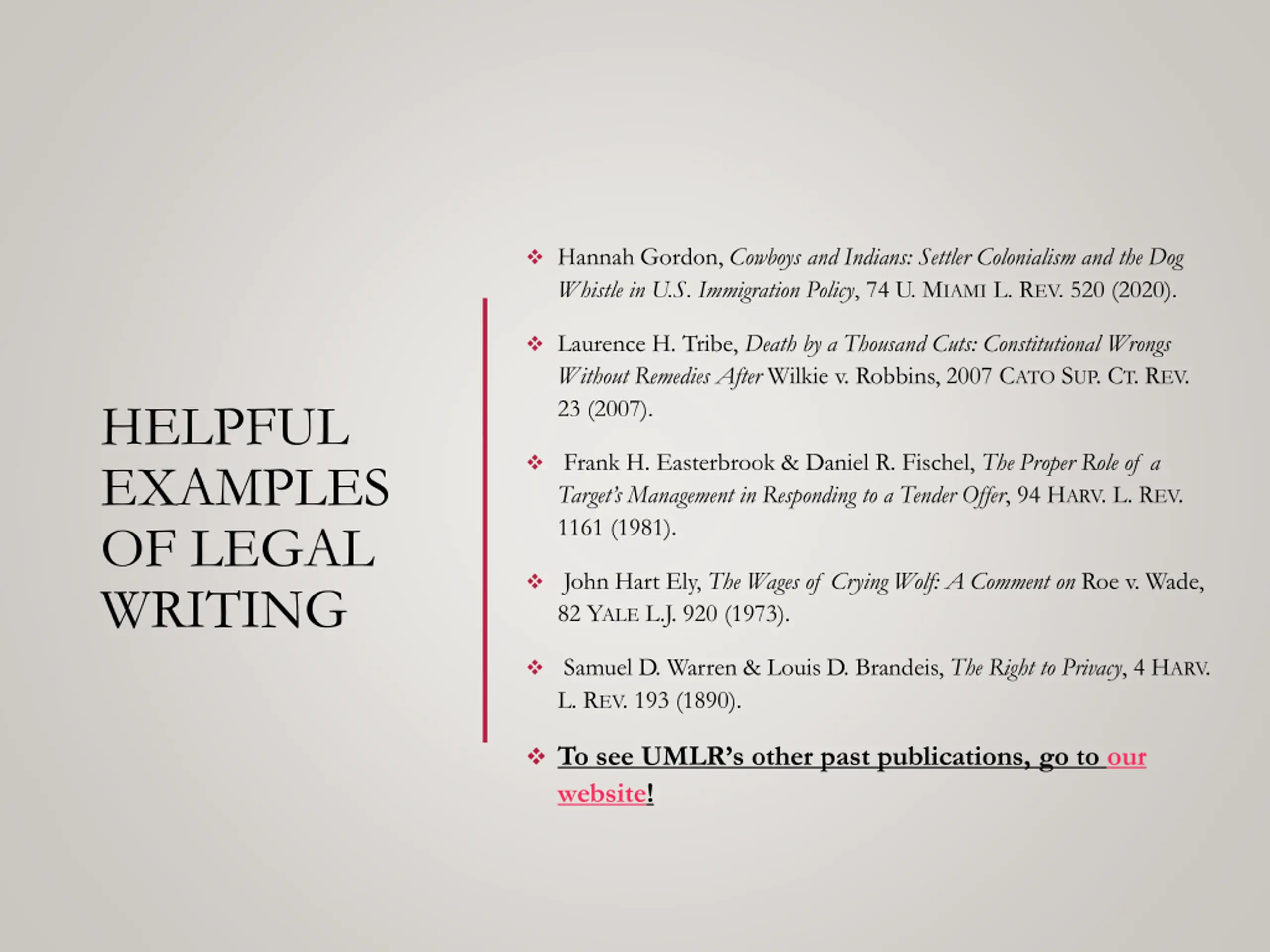 Hannah Gordon, Cowboys and Indians: Settler Colonialism and the Dog Whistle in U.S. Immigration Policy, 74 U. MIAMI L. REV. 520 (2020). Laurence H. Tribe, Death by a Thousand Cuts: Constitutional Wrongs Without Remedies After Wilkie v. Robbins, 2007 CATO SUP. CT. REV. 23 (2007). HELPFUL EXAMPLES OF LEGAL WRITING Frank H. Easterbrook & Daniel R. Fischel, The Proper Role of a Target s Management in Responding to a Tender Offer,94 HARV. L. REV. 1161 (1981). John Hart Ely, The Wages of Crying Wolf: A Comment on Roe v. Wade, 82 YALE L.J. 920 (1973). Samuel D. Warren & Louis D. Brandeis, The Right to Privacy, 4 HARV. L. REV. 193 (1890). To see UMLR s other past publications, go to our website!
