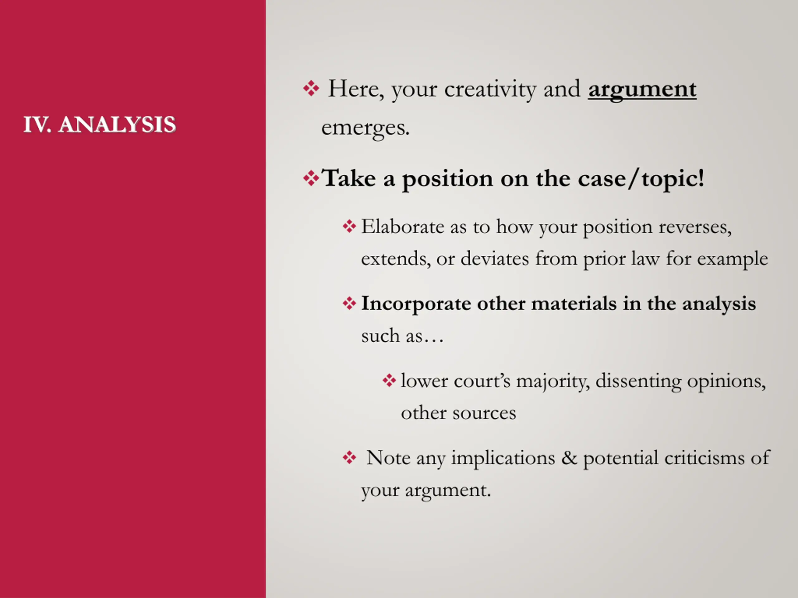 Here, your creativity and argument emerges. IV. ANALYSIS Take a position on the case/topic! Elaborate as to how your position reverses, extends, or deviates from prior law for example Incorporate other materials in the analysis such as lower court s majority, dissenting opinions, other sources Note any implications & potential criticisms of your argument.
