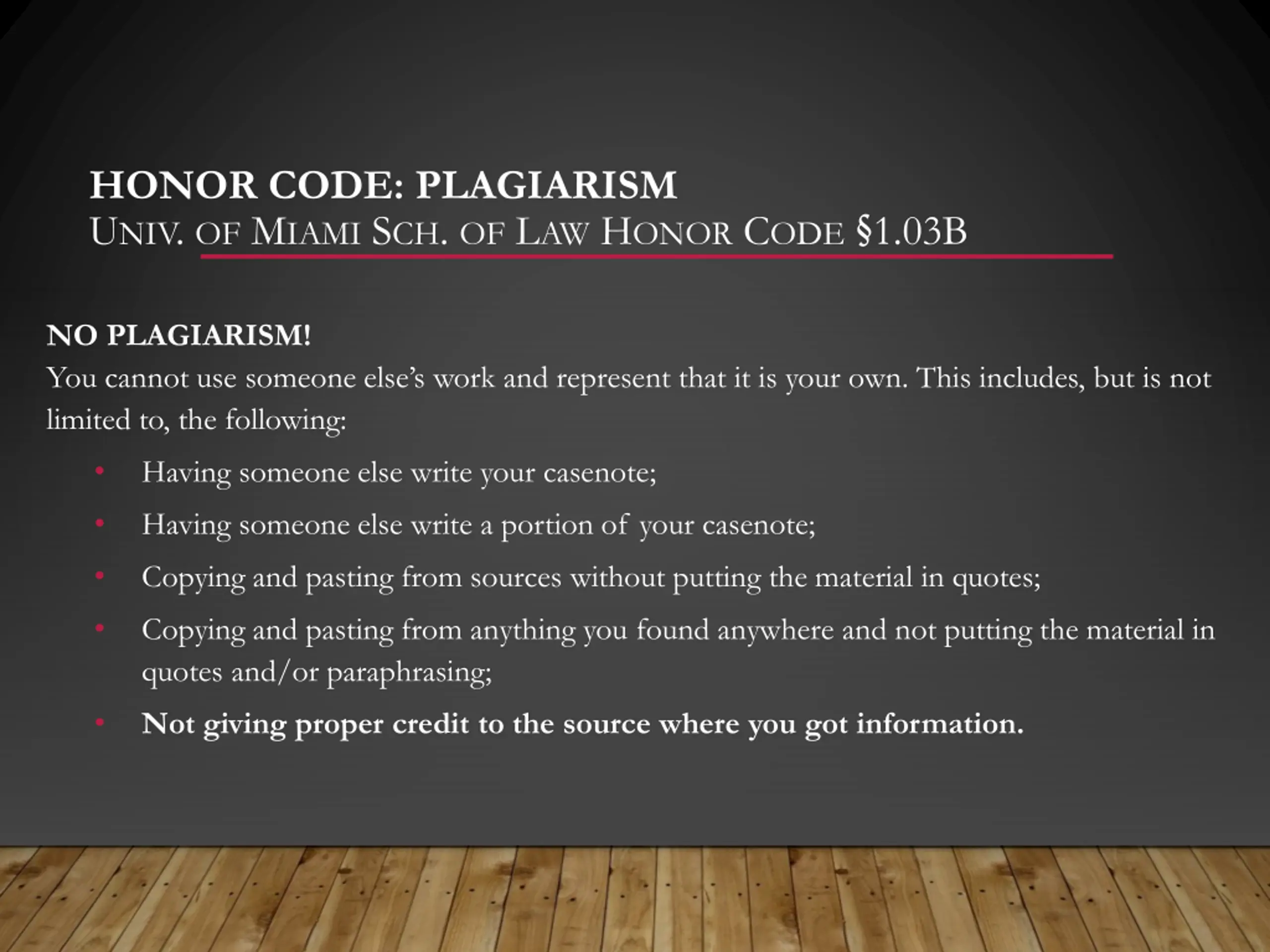 HONOR CODE: PLAGIARISM UNIV. OF MIAMI SCH. OF LAW HONOR CODE 1.03B NO PLAGIARISM! You cannot use someone else s work and represent that it is your own. This includes, but is not limited to, the following: Having someone else write your casenote; Having someone else write a portion of your casenote; Copying and pasting from sources without putting the material in quotes; Copying and pasting from anything you found anywhere and not putting the material in quotes and/or paraphrasing; Not giving proper credit to the source where you got information.