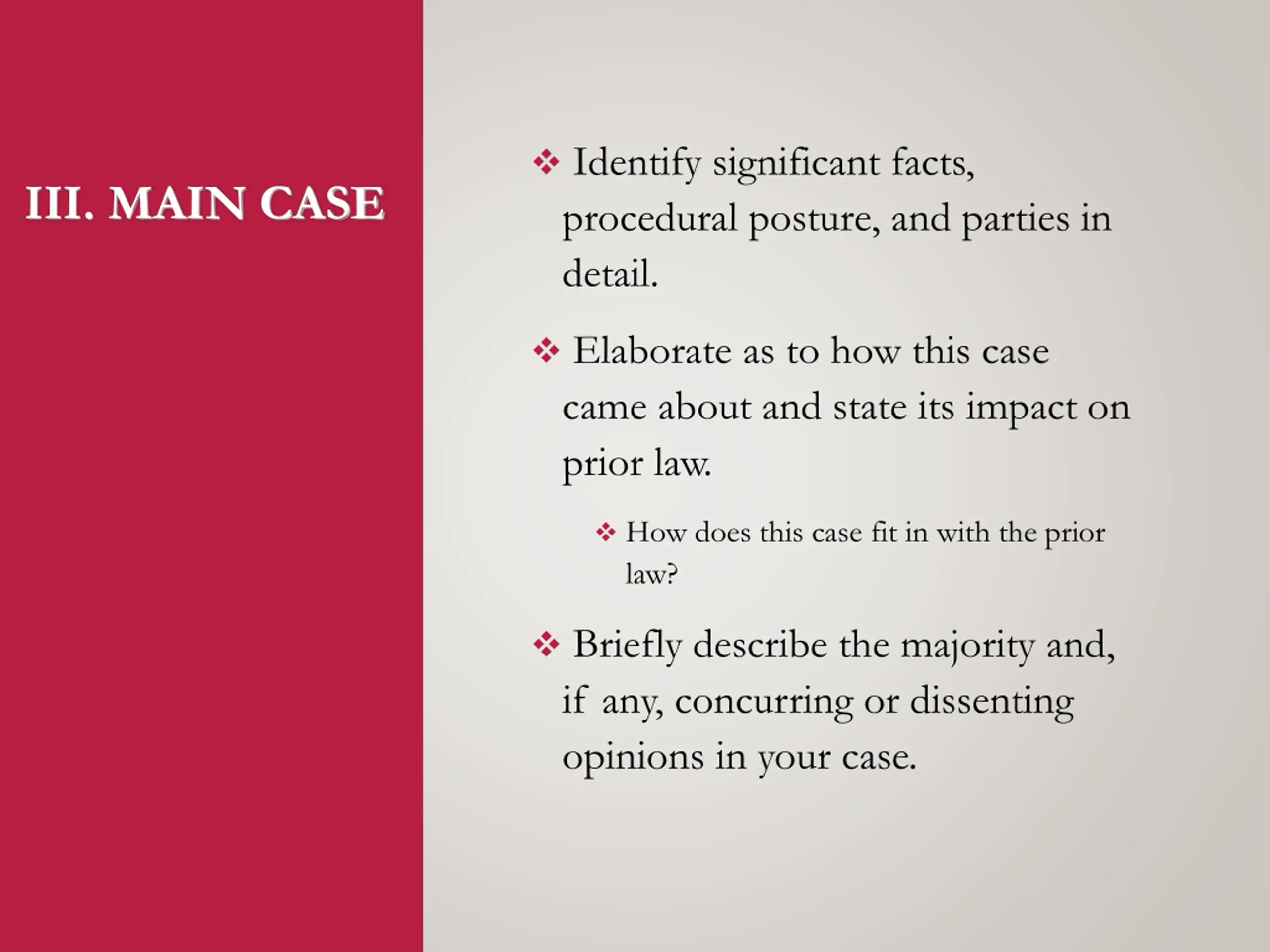 Identify significant facts, procedural posture, and parties in detail. III. MAIN CASE Elaborate as to how this case came about and state its impact on prior law. How does this case fit in with the prior law? Briefly describe the majority and, if any, concurring or dissenting opinions in your case.