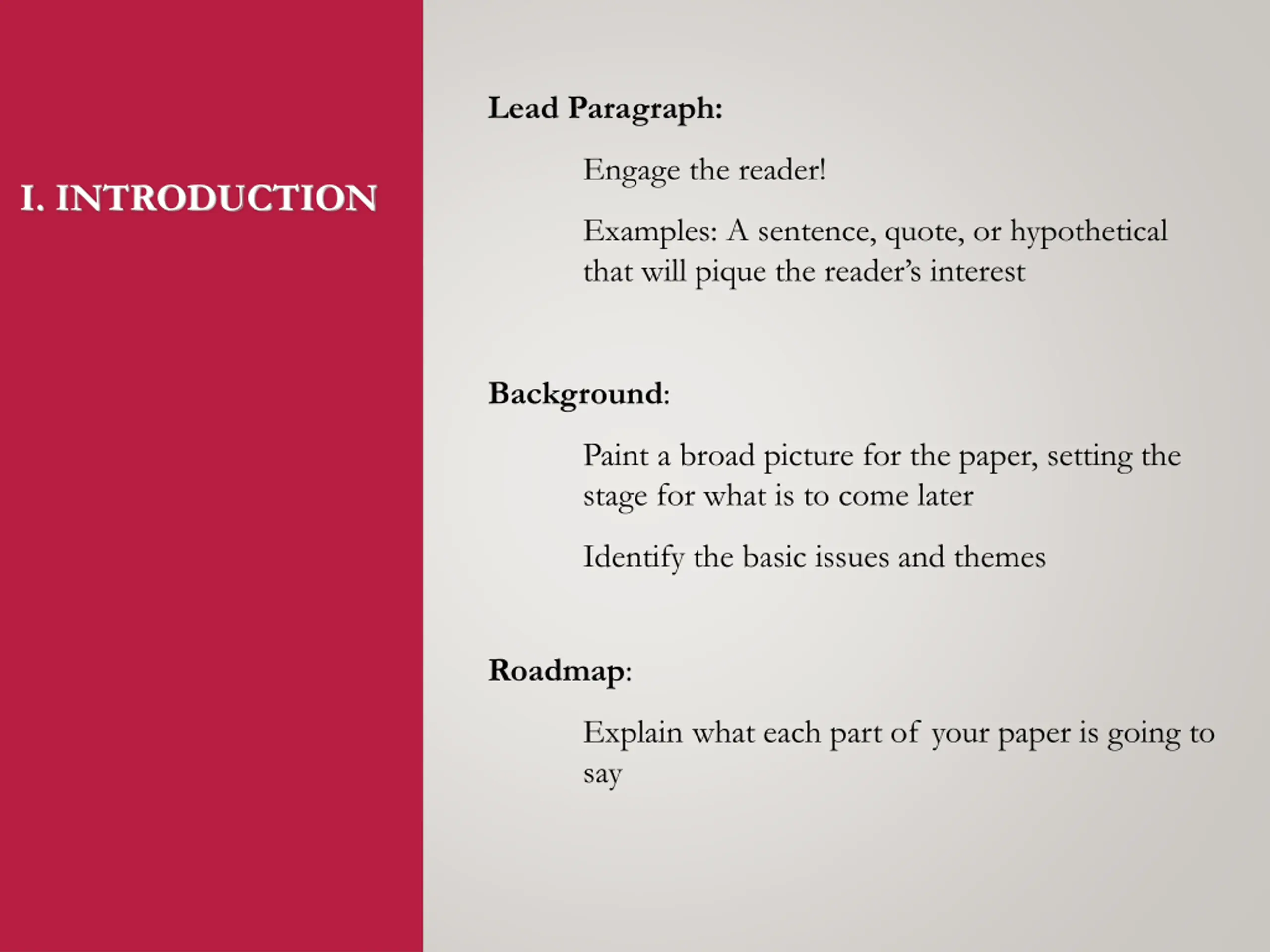 Lead Paragraph: Engage the reader! I. INTRODUCTION Examples: A sentence, quote, or hypothetical that will pique the reader s interest Background: Paint a broad picture for the paper, setting the stage for what is to come later Identify the basic issues and themes Roadmap: Explain what each part of your paper is going to say