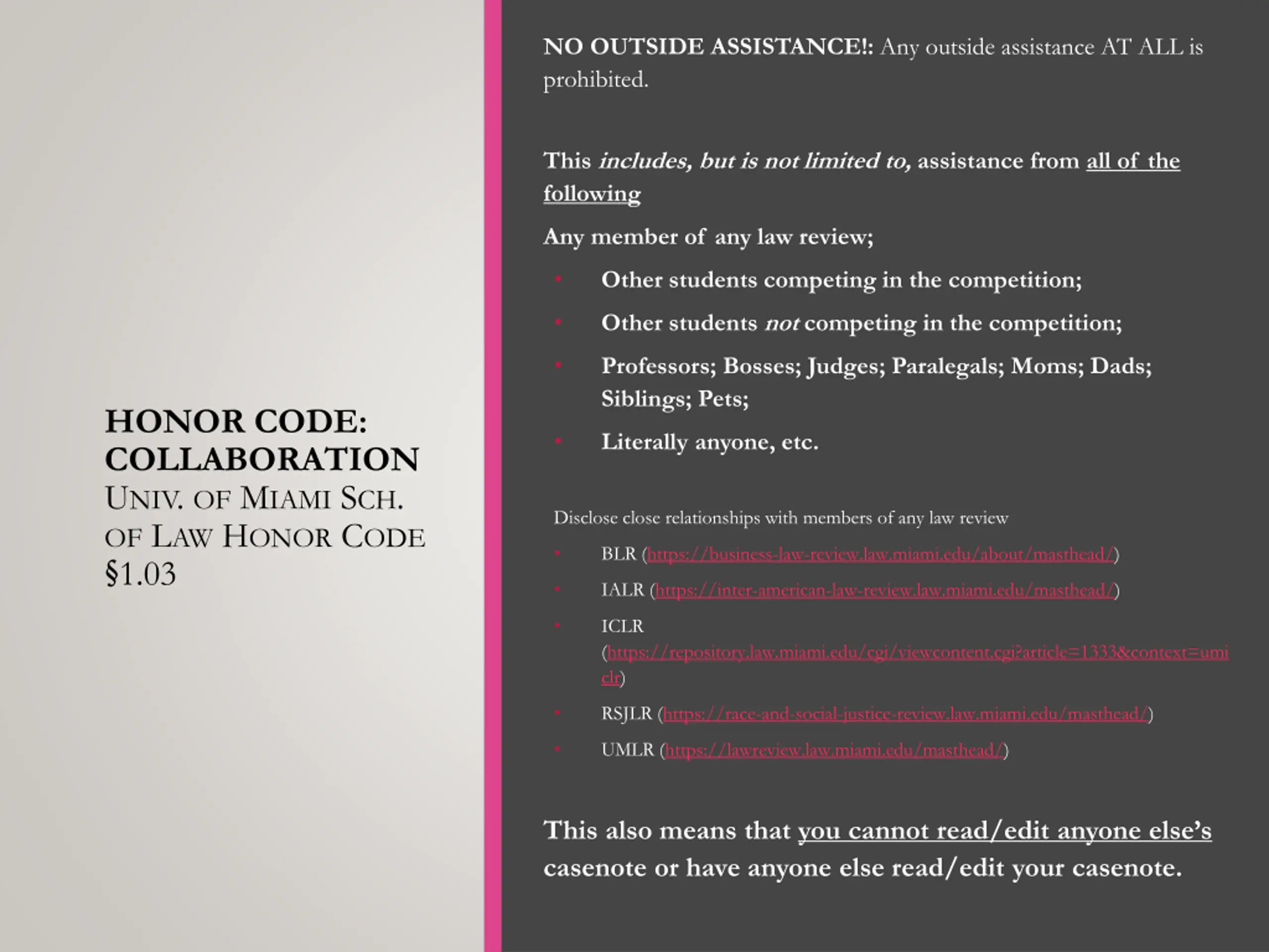 NO OUTSIDE ASSISTANCE!: Any outside assistance AT ALL is prohibited. This includes, but is not limited to, assistance from all of the following Any member of any law review; Other students competing in the competition; Other students not competing in the competition; Professors; Bosses; Judges; Paralegals; Moms; Dads; Siblings; Pets; HONOR CODE: COLLABORATION UNIV. OF MIAMI SCH. OF LAW HONOR CODE 1.03 Literally anyone, etc. Disclose close relationships with members of any law review BLR (https://business-law-review.law.miami.edu/about/masthead/) IALR (https://inter-american-law-review.law.miami.edu/masthead/) ICLR (https://repository.law.miami.edu/cgi/viewcontent.cgi?article=1333&context=umi clr) RSJLR (https://race-and-social-justice-review.law.miami.edu/masthead/) UMLR (https://lawreview.law.miami.edu/masthead/) This also means that you cannot read/edit anyone else s casenote or have anyone else read/edit your casenote.