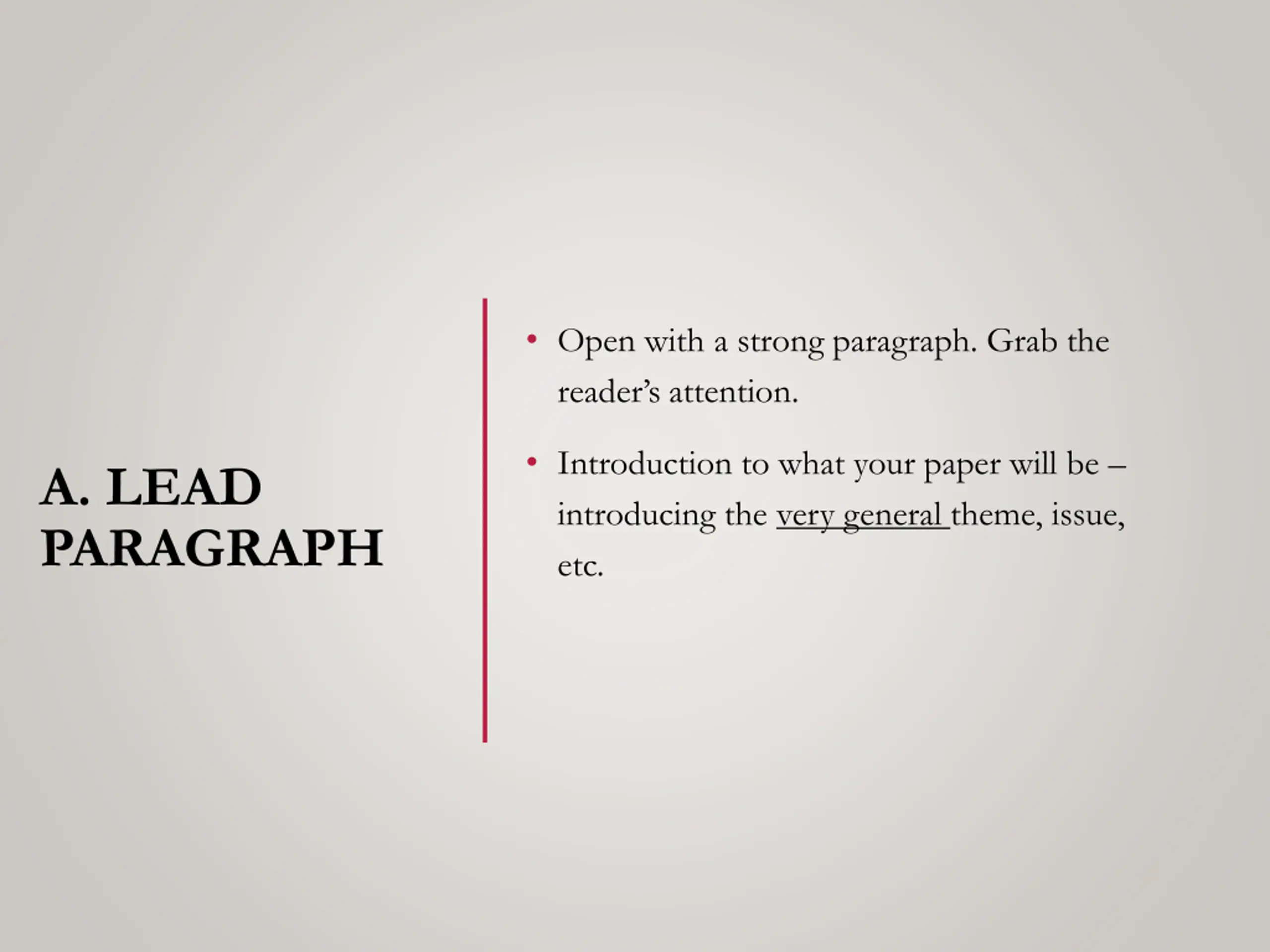 Open with a strong paragraph. Grab the reader s attention. Introduction to what your paper will be introducing the very general theme, issue, etc. A. LEAD PARAGRAPH