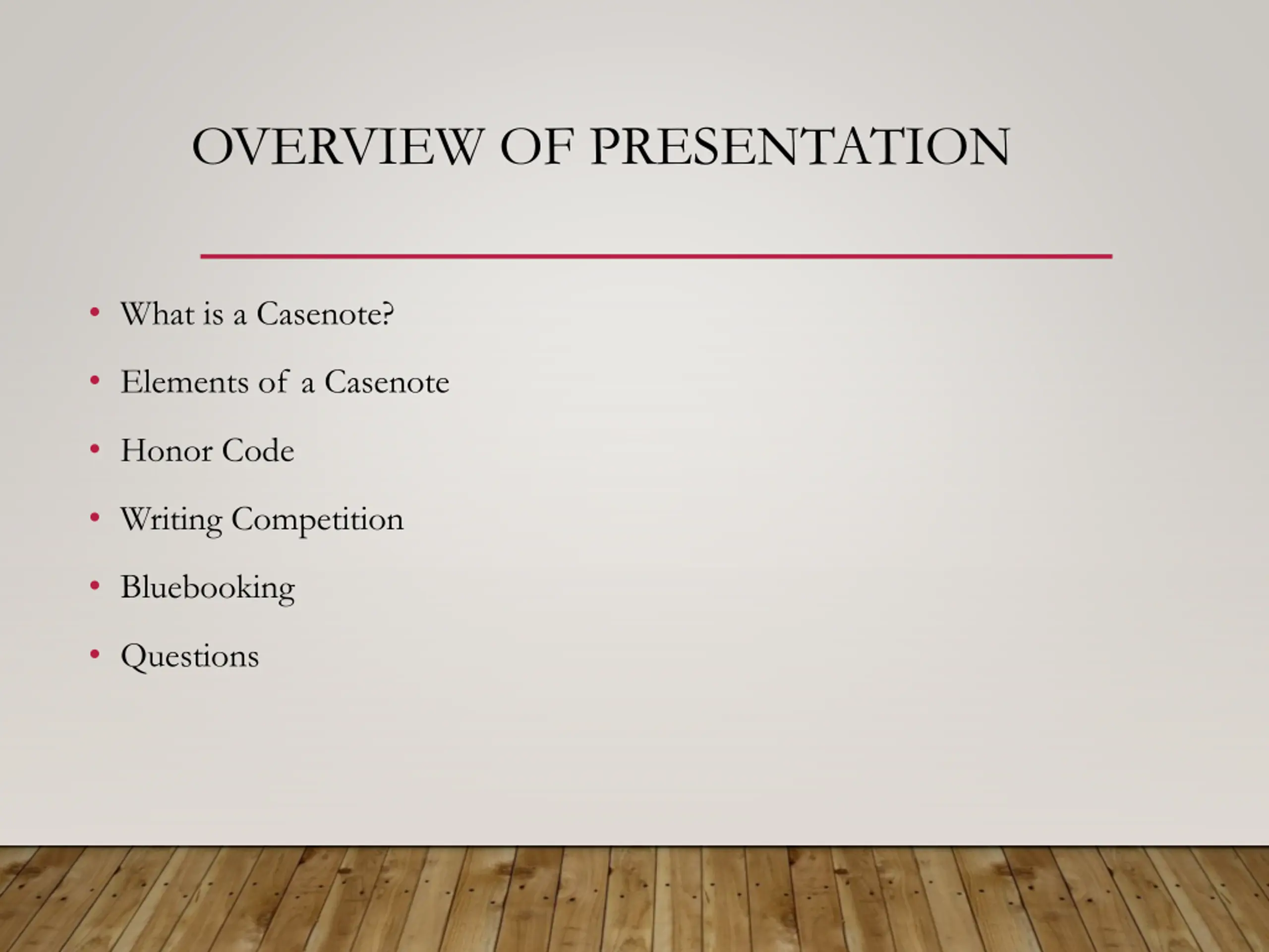 OVERVIEW OF PRESENTATION What is a Casenote? Elements of a Casenote Honor Code Writing Competition Bluebooking Questions
